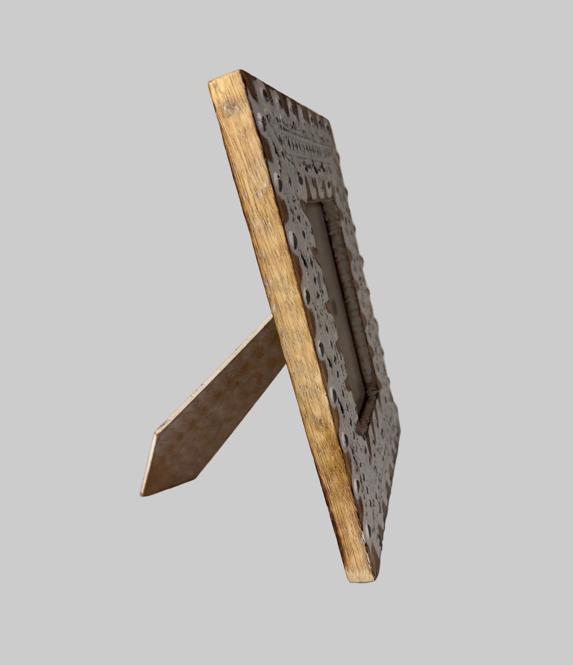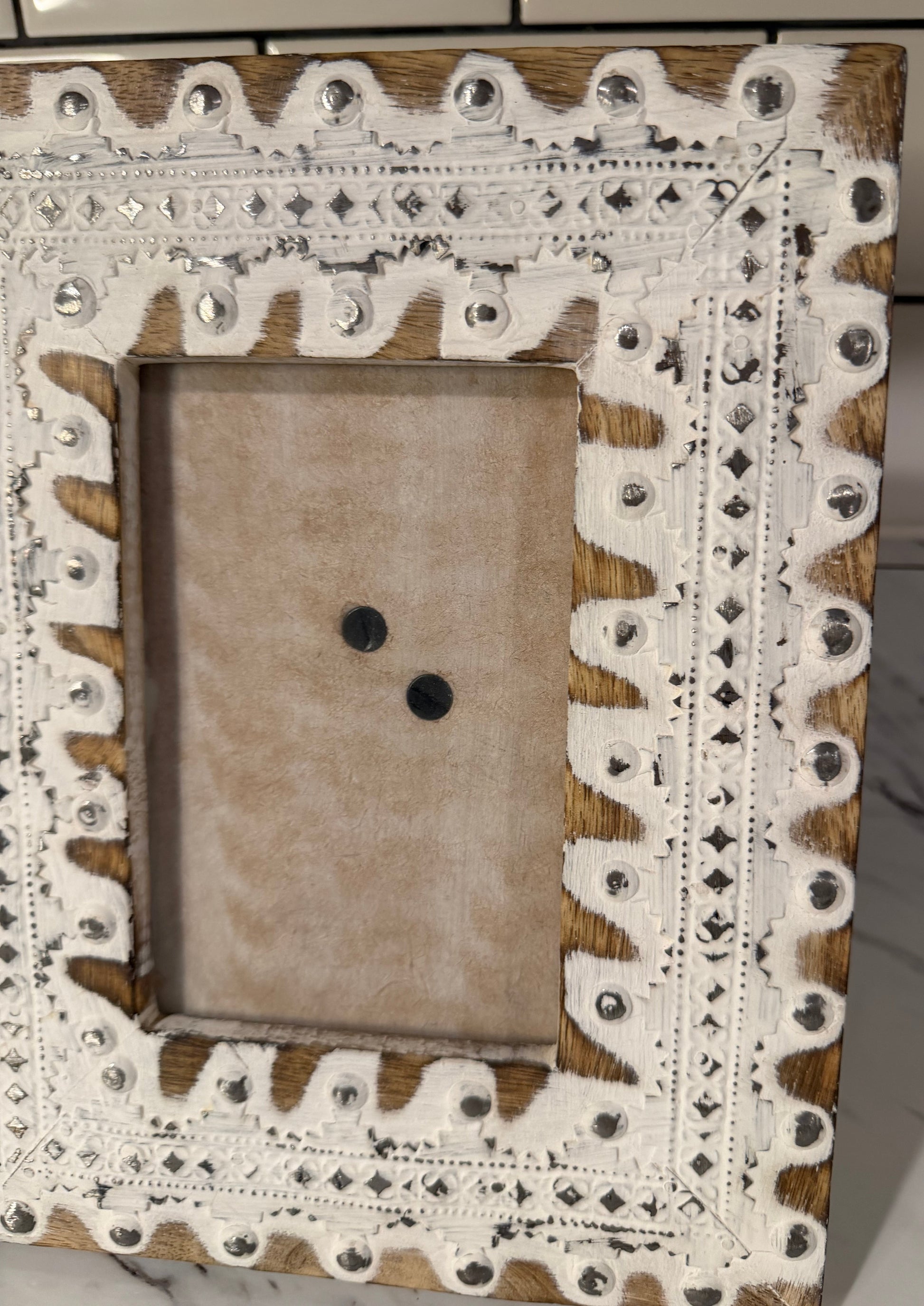 Bring charm and character to your walls or tabletop with this BoHo-inspired rustic farmhouse wooden picture frame. Its warm wood tones and delicate silver metal detailing make it a versatile piece for any decor style.