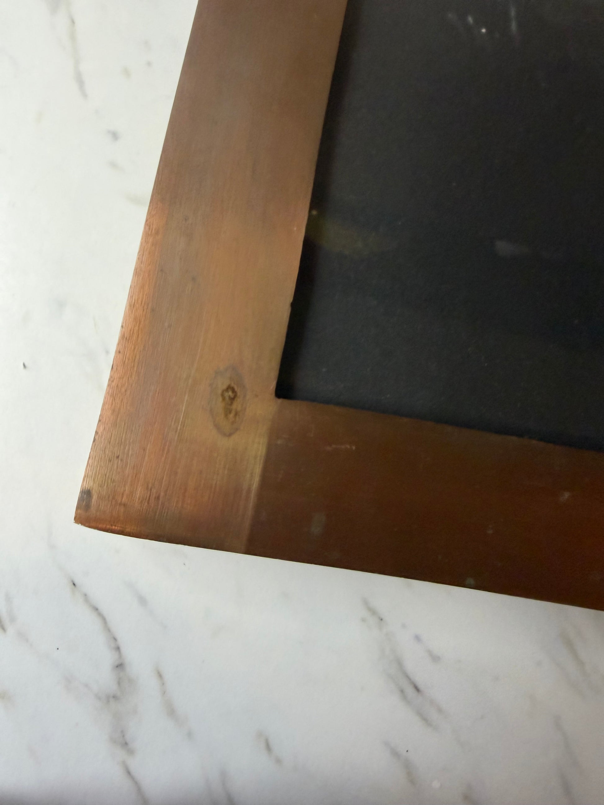 The glass corners have been cut to fit the interior of the frame, indicating the glass was custom-fit rather than factory-sized. The copper has a warm, evenly aged tone with no green corrosion present.