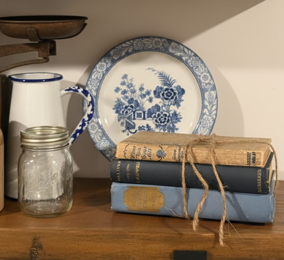 A beautifully curated stack of three vintage/antique novels, thoughtfully tied with rustic twine and styled atop a blue and white decorative plate. This timeless trio blends literary history with cozy, collected-home charm—perfect for shelves, coffee tables, or vignette styling.