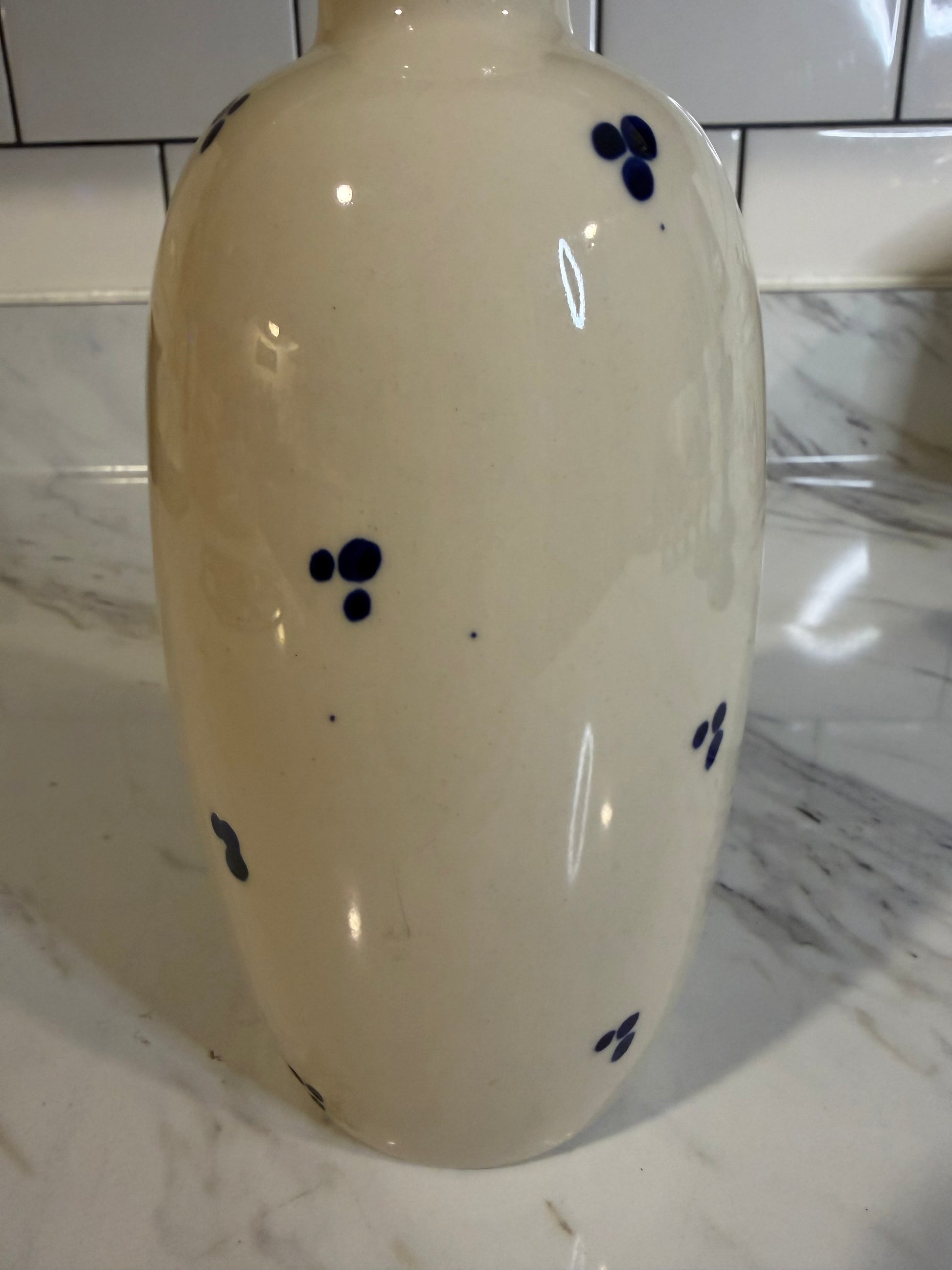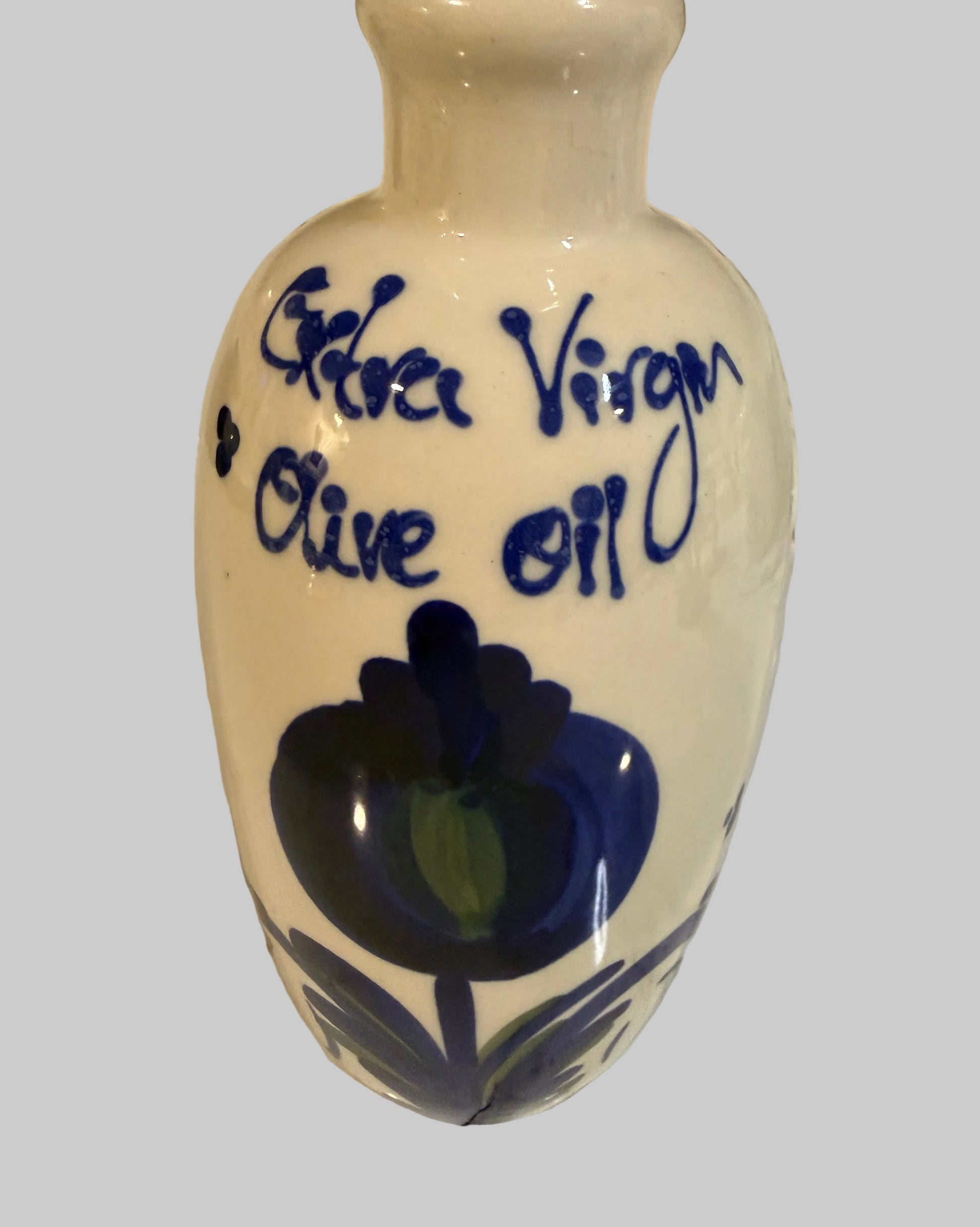 Bring old-world charm to your kitchen with this glazed ceramic olive oil bottle made in Spain. Featuring a classic blue floral design on a warm cream glaze, this bottle is beautifully detailed and labeled “Extra-Virgin Olive Oil,” making it both decorative and functional.