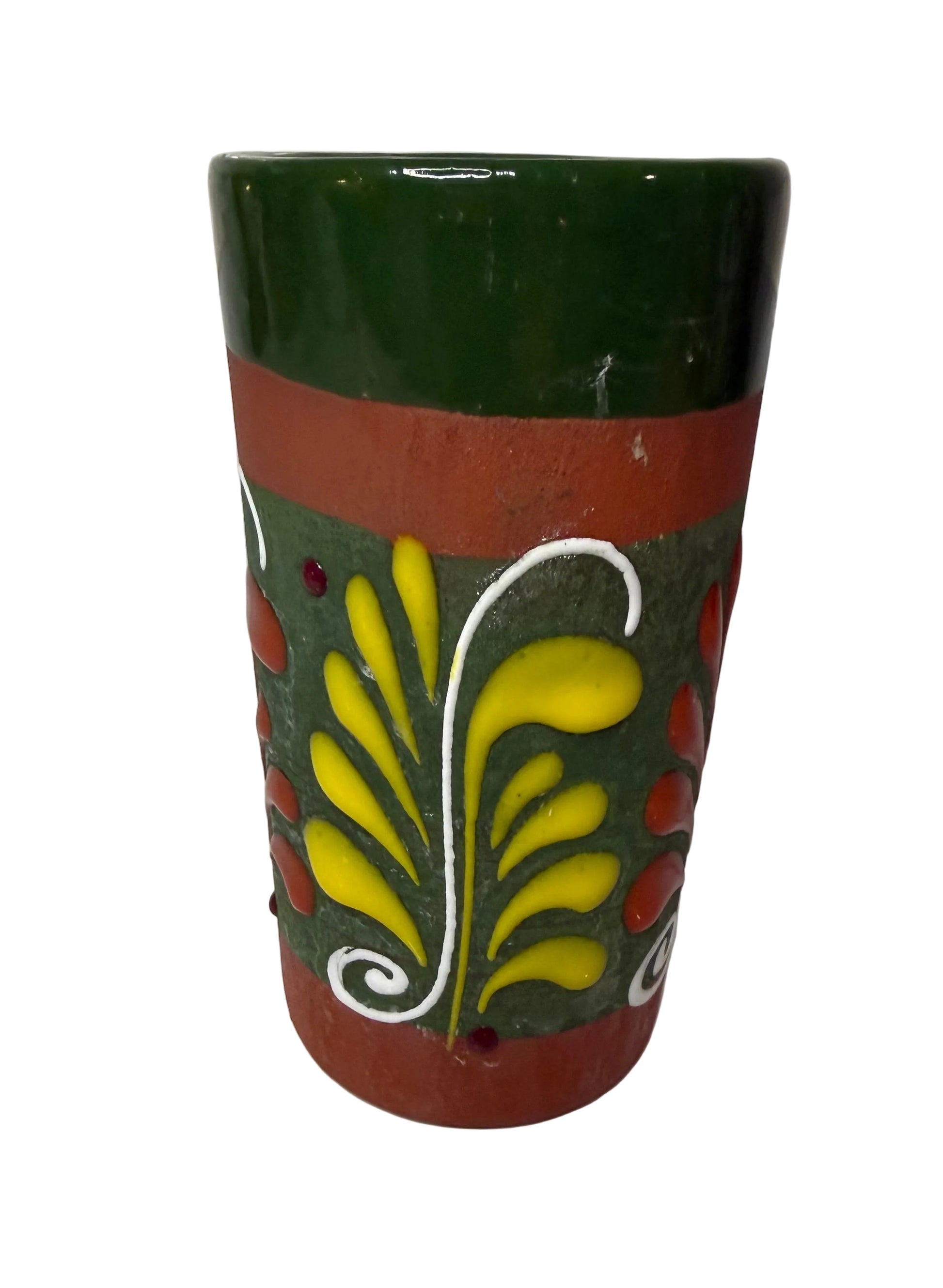 This charming hand-painted Mexican folk art vase is a celebration of traditional artisan craftsmanship. Made from natural red clay and finished with beautifully raised, textured paintwork, this petite piece carries the warmth and soul of old-world pottery.