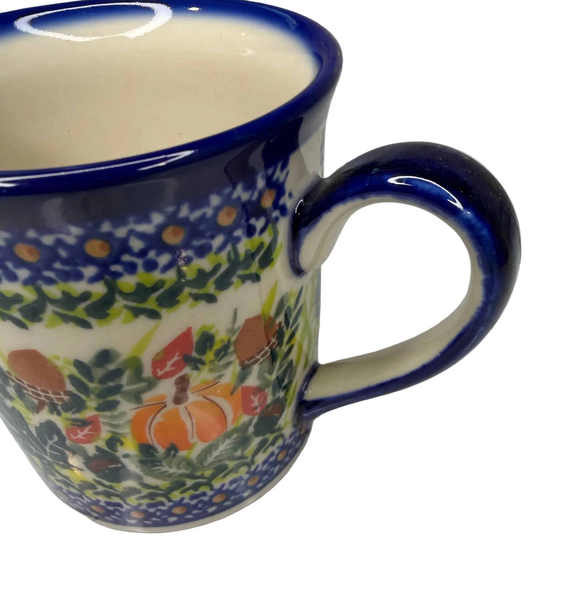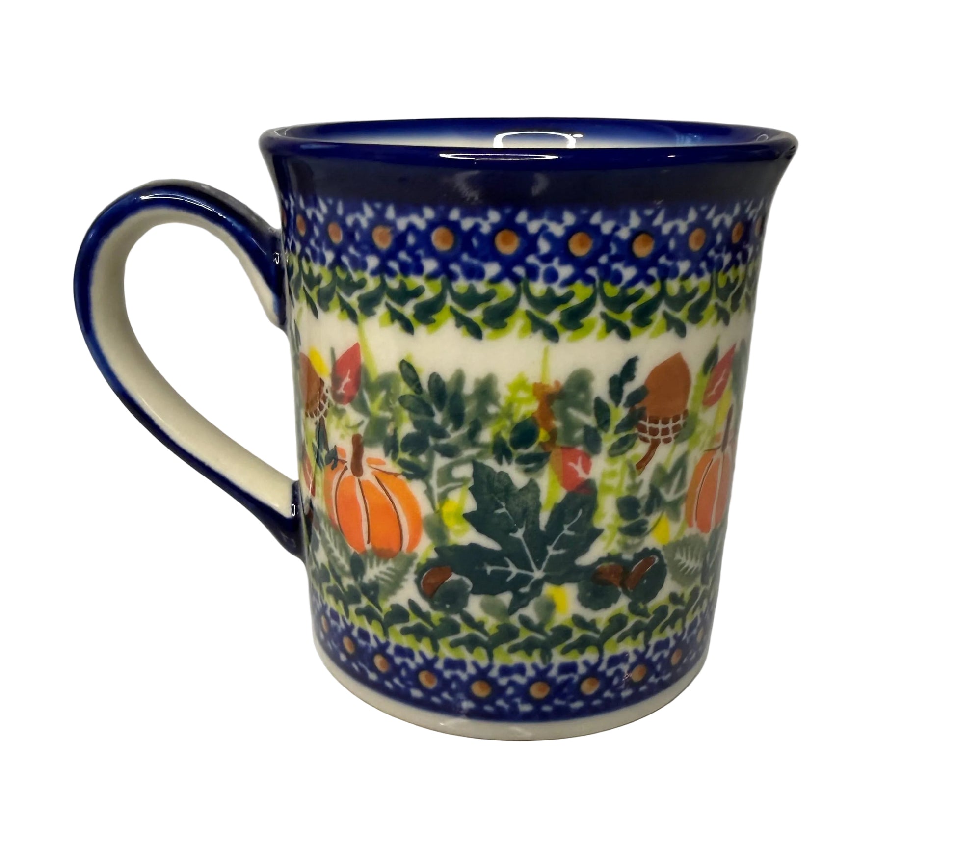 The intricate autumn-themed pattern features pumpkins, acorns, and fall leaves, capturing the warm, seasonal charm of handcrafted Polish Pottery. Durable and versatile, this mug is perfect for daily use or for display as part of a curated collection.