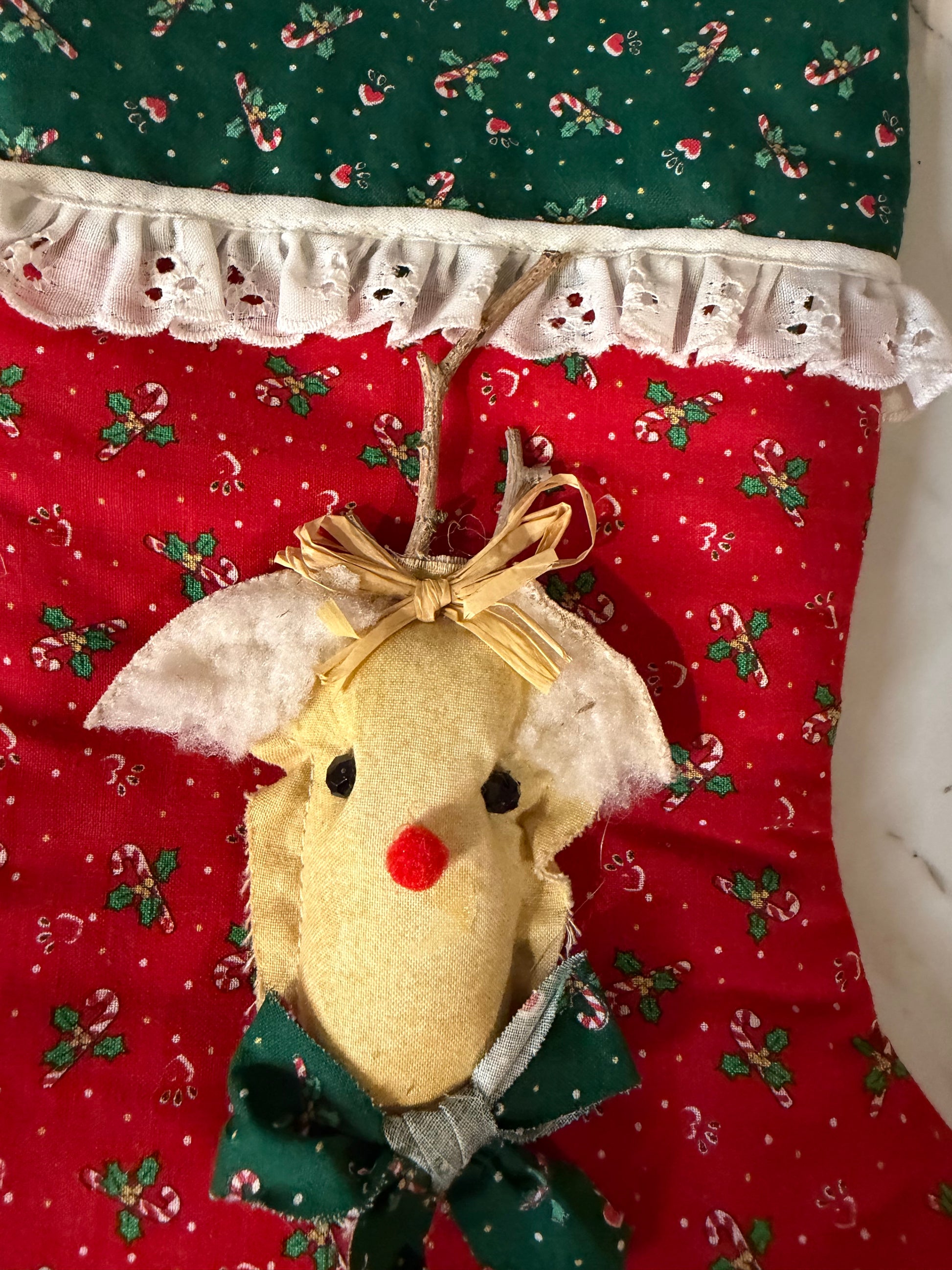 Handmade Rudolph Stocking – Red & Green Holly Berry Fabric - Lace Trim
