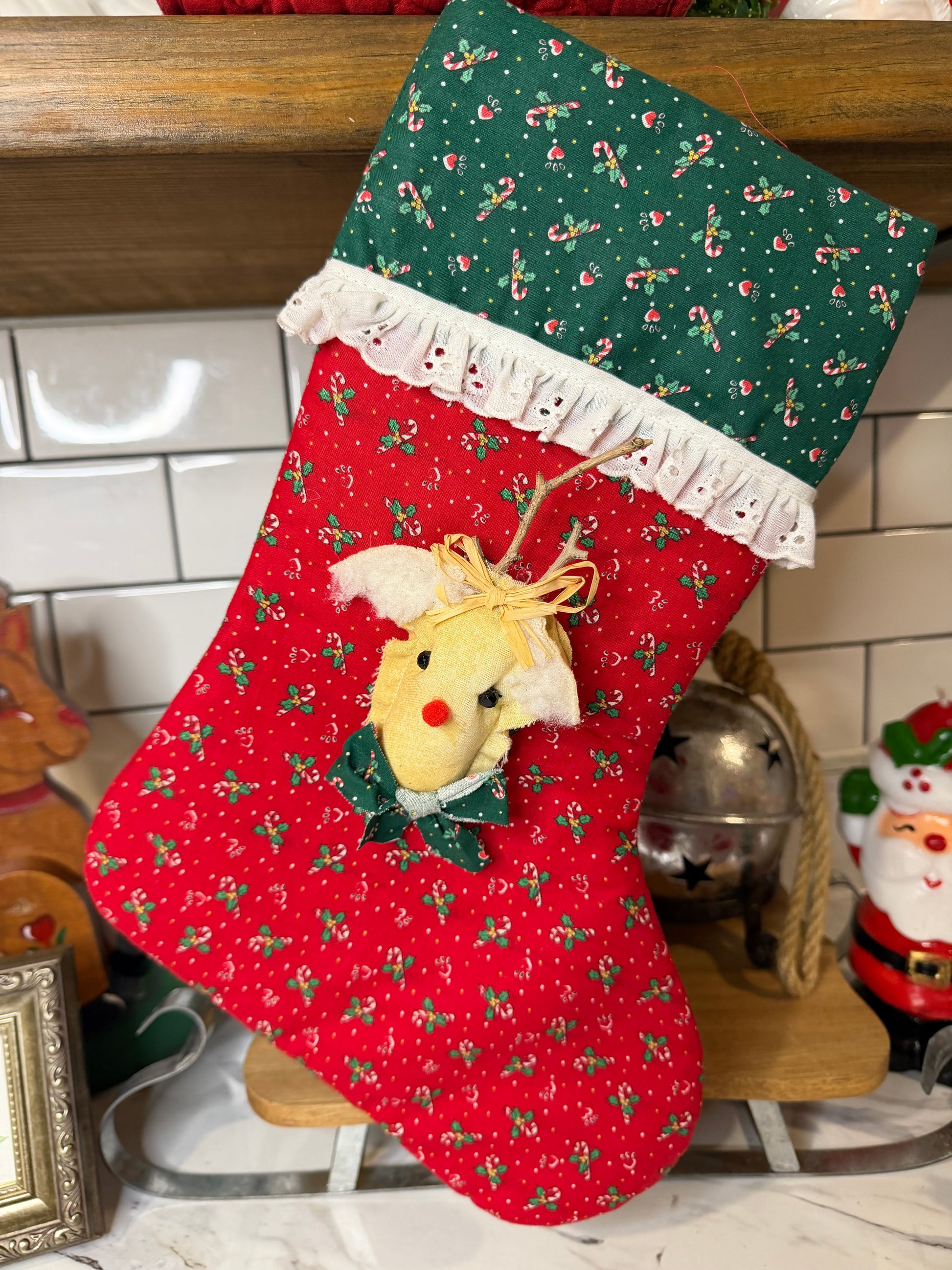 Add a festive touch to your holiday décor with this handmade Rudolph stocking! Crafted from cheerful red and green Holly Berry fabric, it features a Rudolph appliqué. The top rim is trimmed with coordinating fabric and adorned with eyelet cotton lace, creating a charming, handcrafted look perfect for mantels, holiday displays, or gifting.