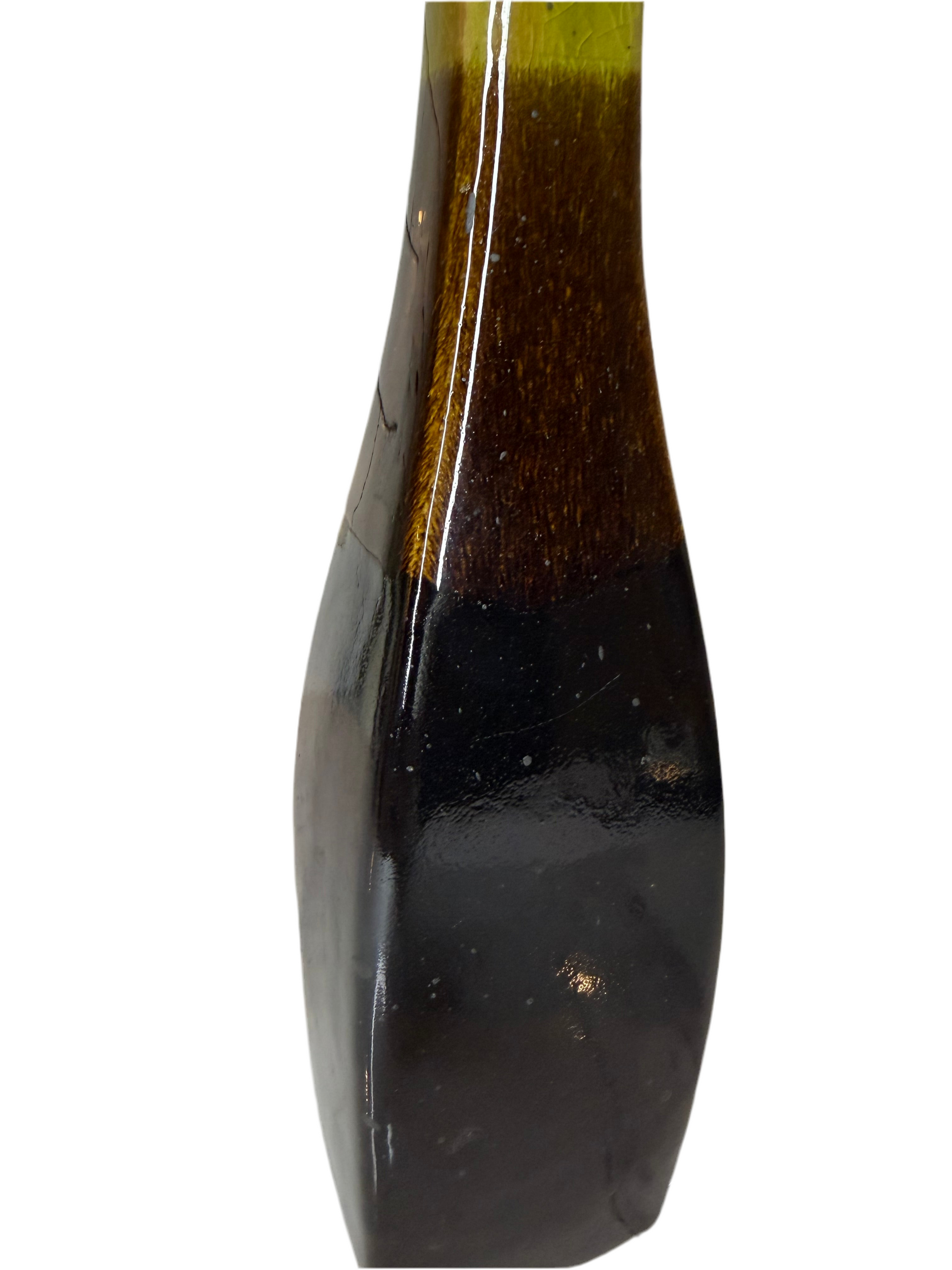 The vase has a bottle shape with a narrow neck and a rounded body tapering to a square base, making it perfect for displaying single stems, dried florals, or simply as a striking decorative accent. Handcrafted and artist-signed, this vase embodies the individuality and creativity of vintage studio pottery.