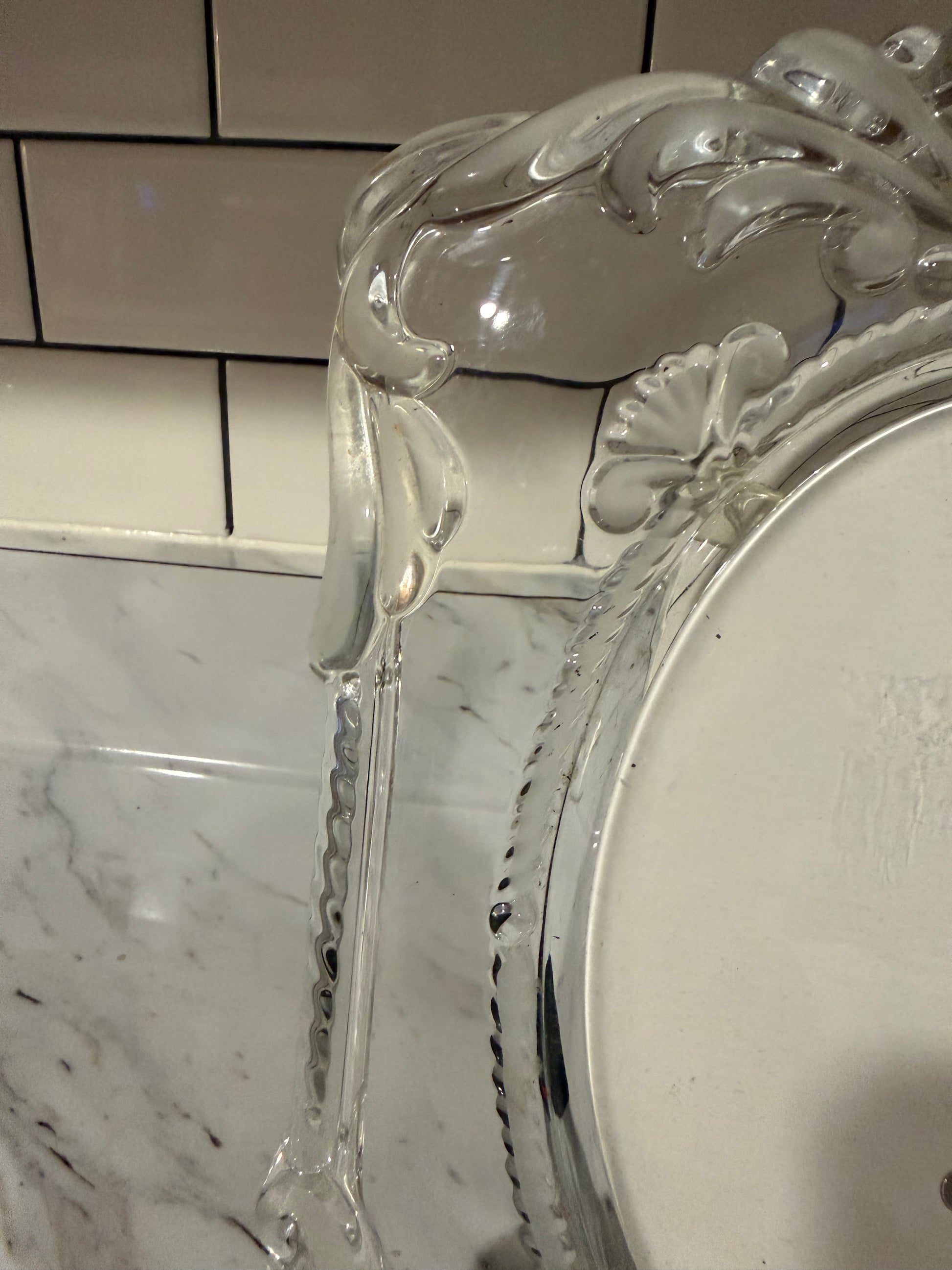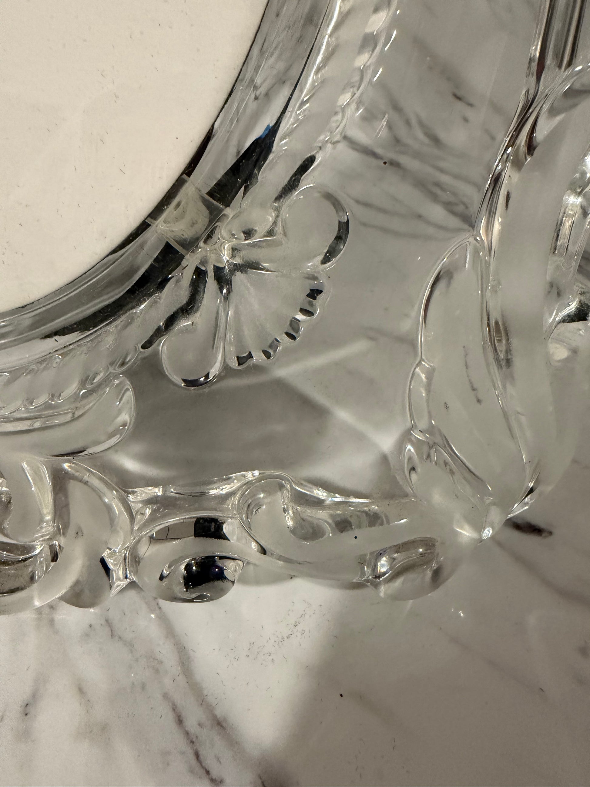- Frosted + clear crystal frame with delicate etched details