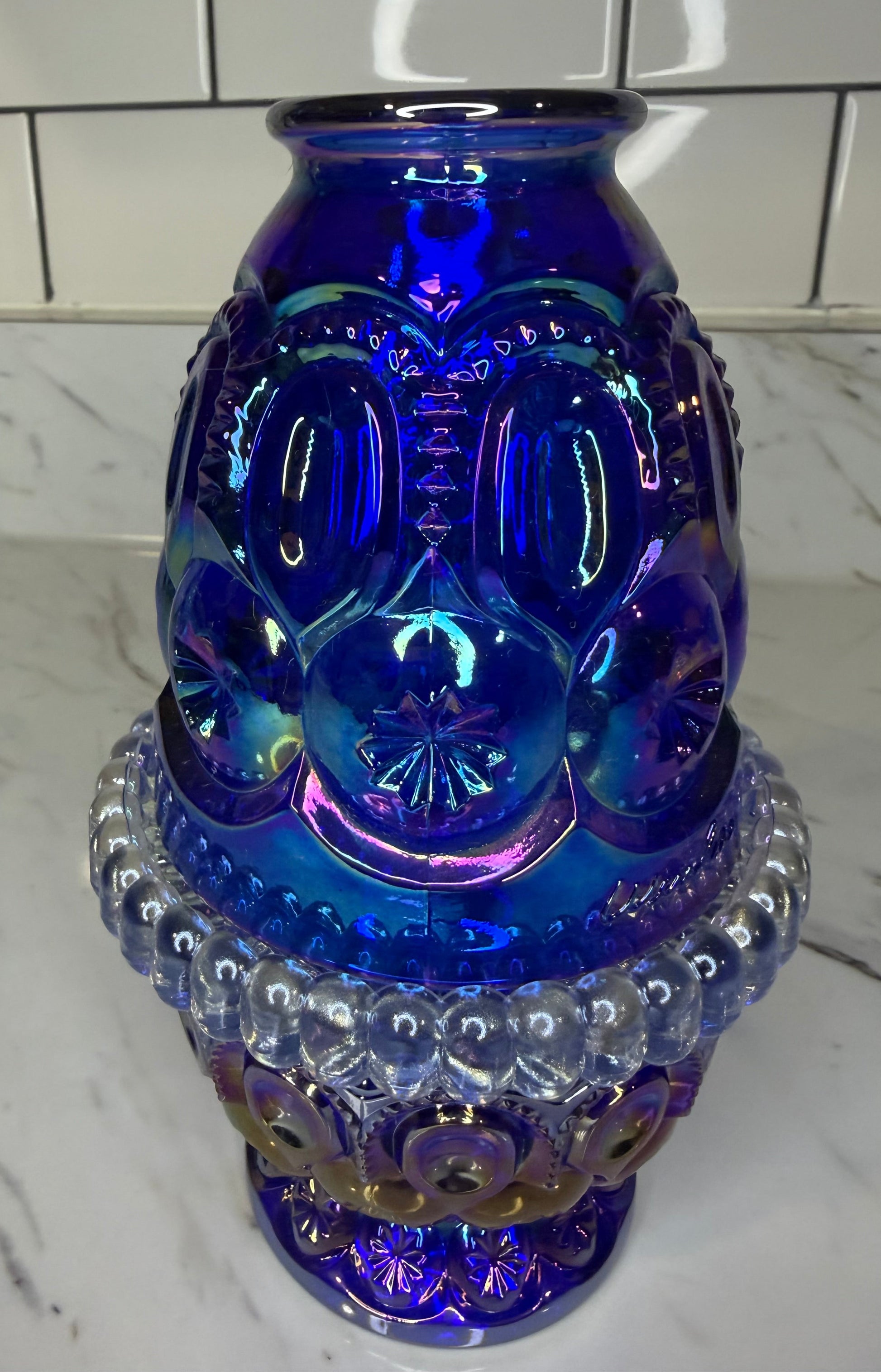 Add a touch of vintage glow to your space with this beautiful Weishar Moon & Star fairy lamp in rich cobalt blue carnival glass. Made in the U.S.A., this classic three-piece fairy lamp is both decorative and functional, casting a warm, magical light when illuminated with a candle.
