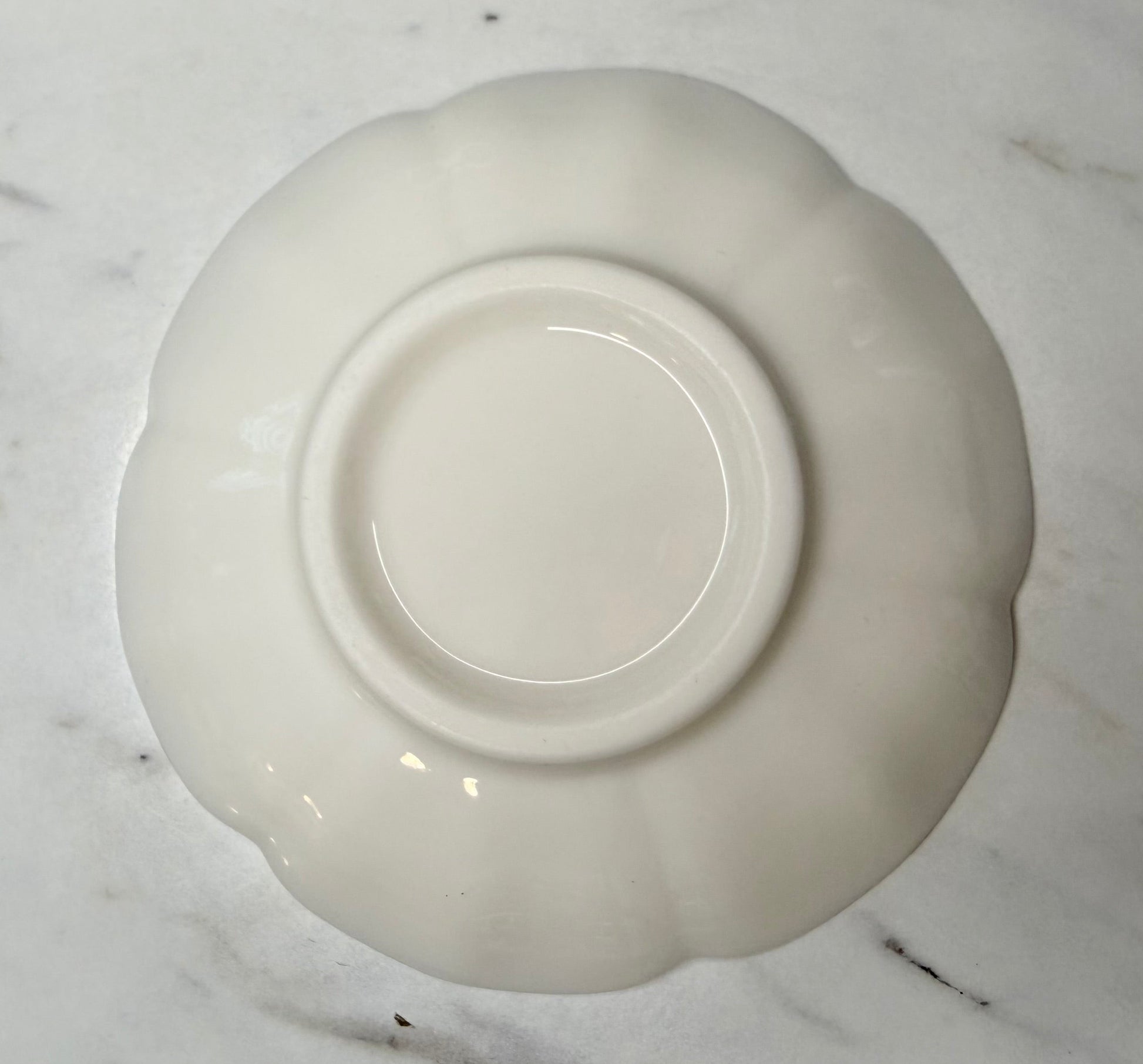 The softly ruffled edge gives it that classic heirloom feel, while the clean white porcelain makes it easy to layer with ironstone, cottage-inspired pieces, or modern farmhouse table settings. Use it traditionally for butter, or style it as a salt dish, tea bag rest, trinket plate, or as part of a thoughtfully layered tablescape.