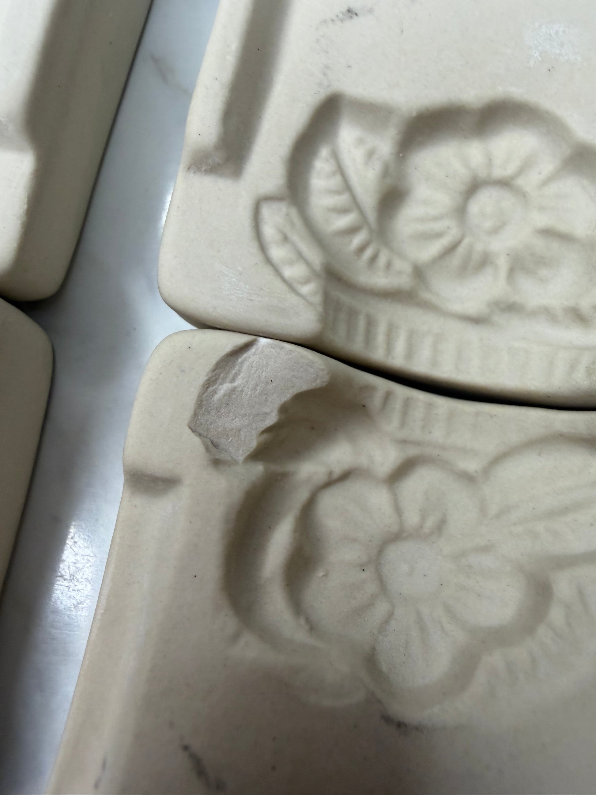 - Condition: Good vintage condition. *One has chip on inside of the mold (pictured). Nothing that takes away from the visual display of the piece.