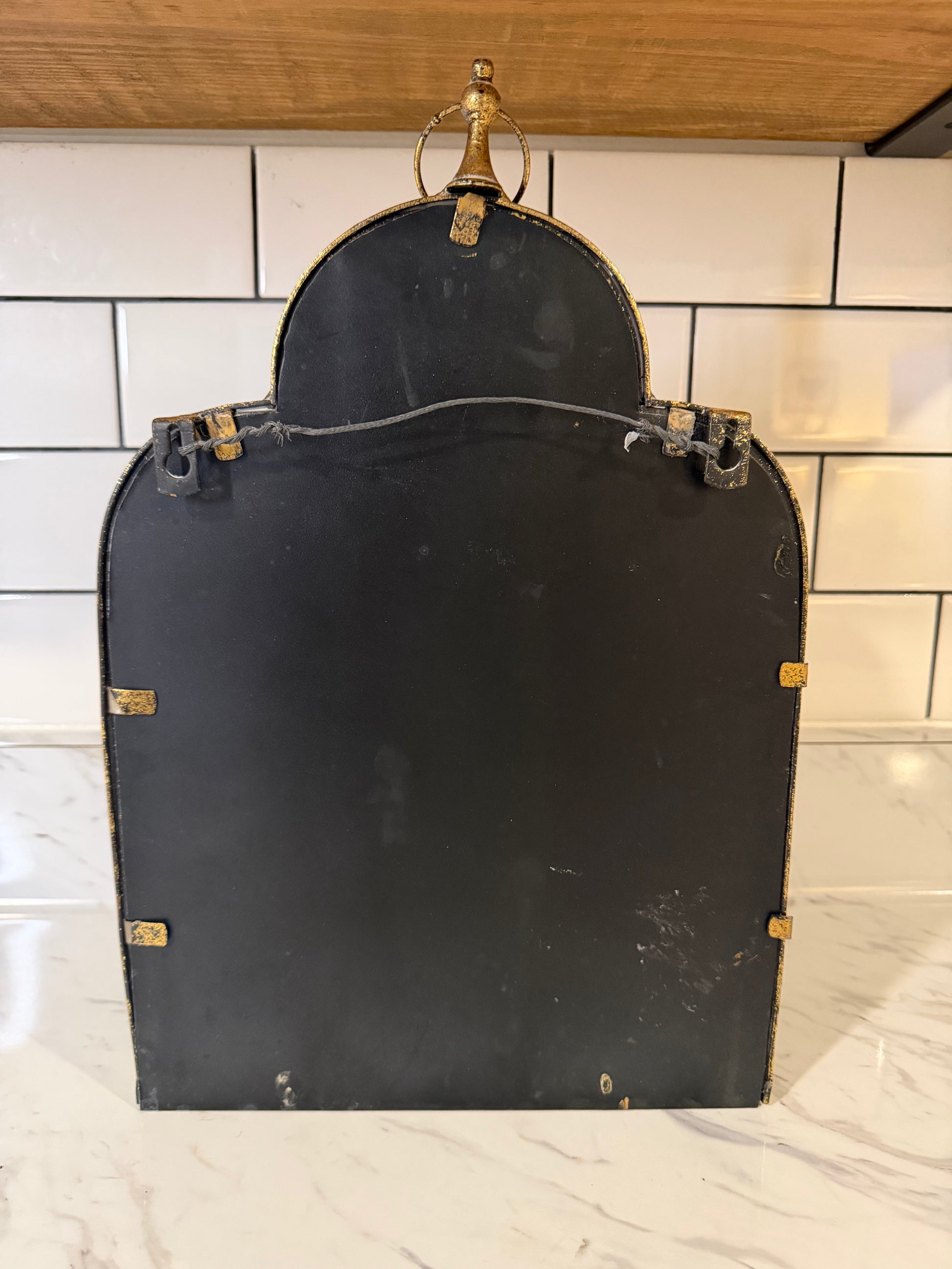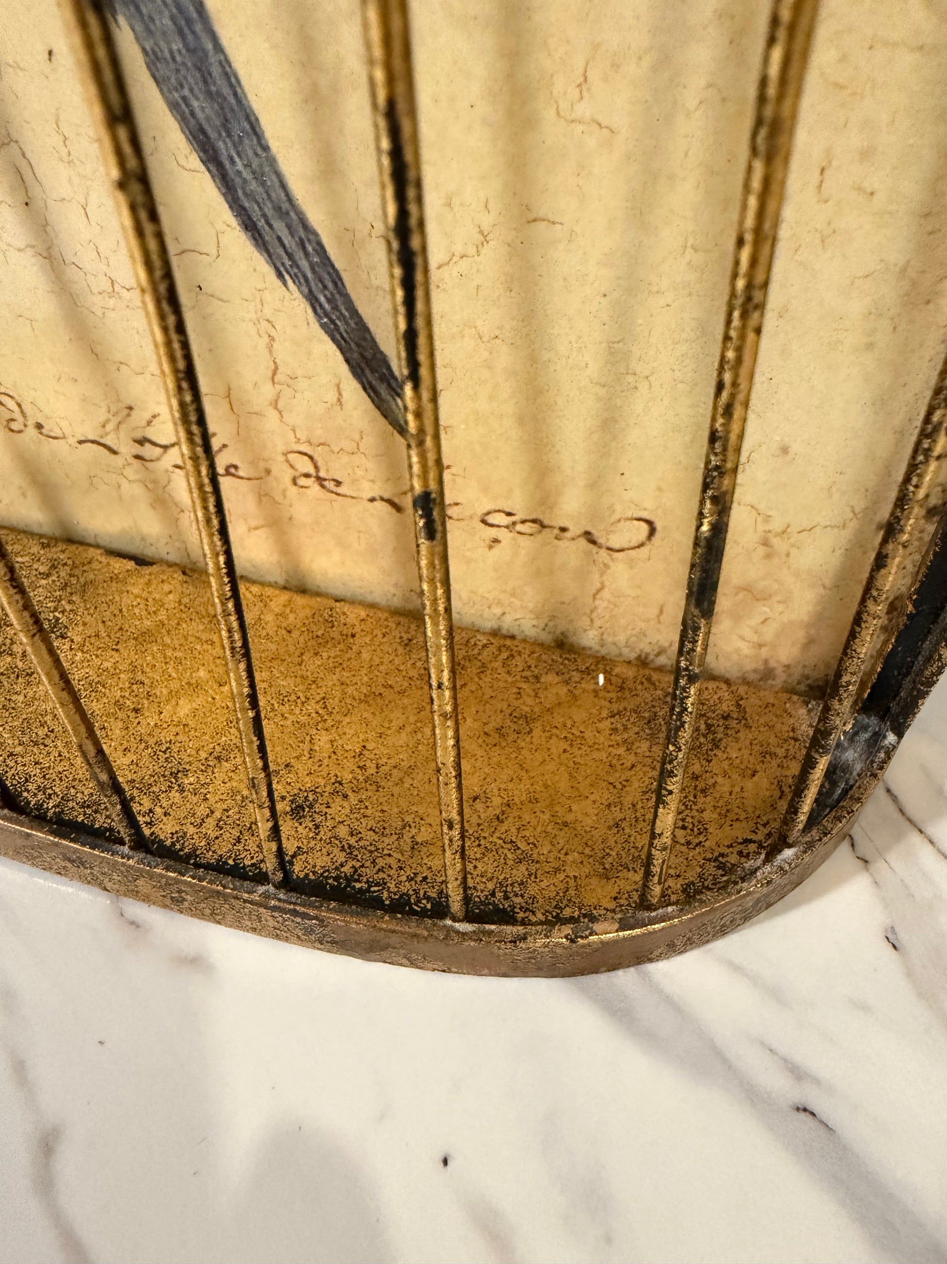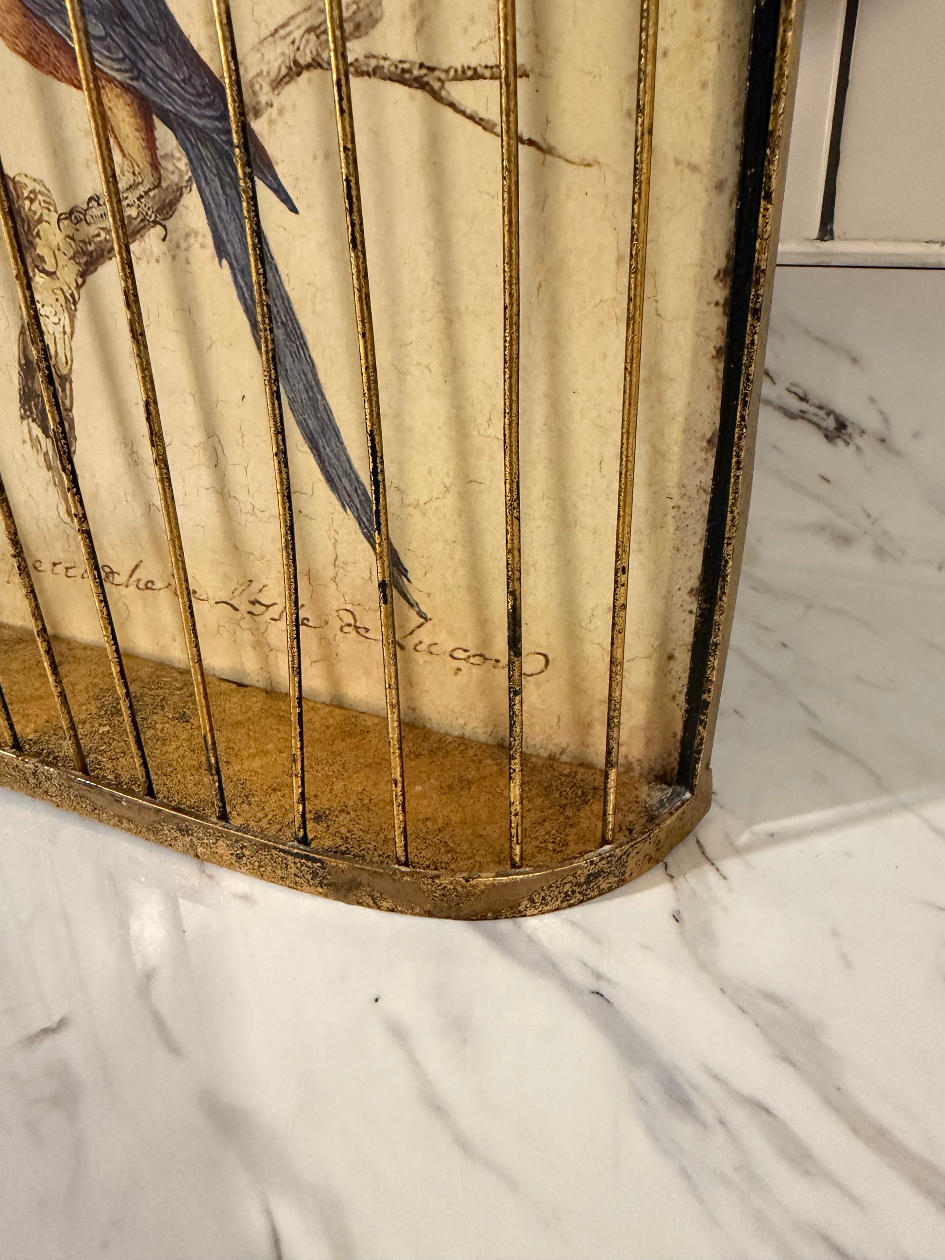 This decorative birdcage wall piece uses the trompe-l’œil technique — French for “deceive the eye.” The flat back panel features a beautifully painted bird on a branch, creating the illusion that it’s perched inside the cage.