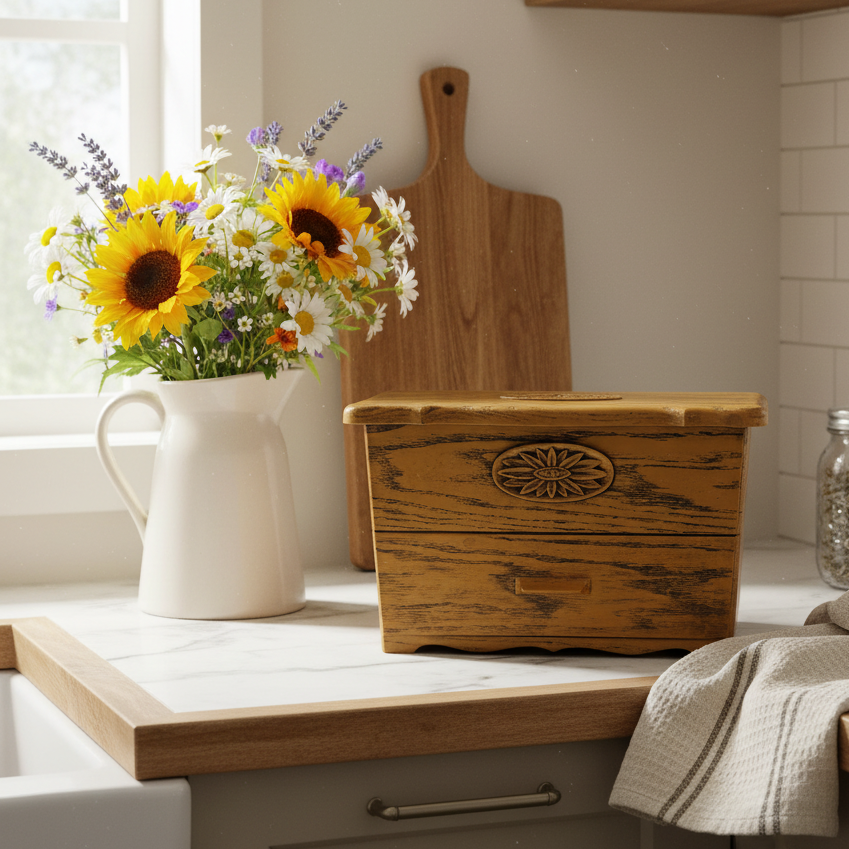 Crafted from durable molded plastic with a textured faux wood finish, it features an embossed floral design on both the lid and front, scalloped edges, and a decorative base. The hinged flip-top lid opens to reveal a divided compartment, while a pull-out drawer at the bottom provides additional storage.