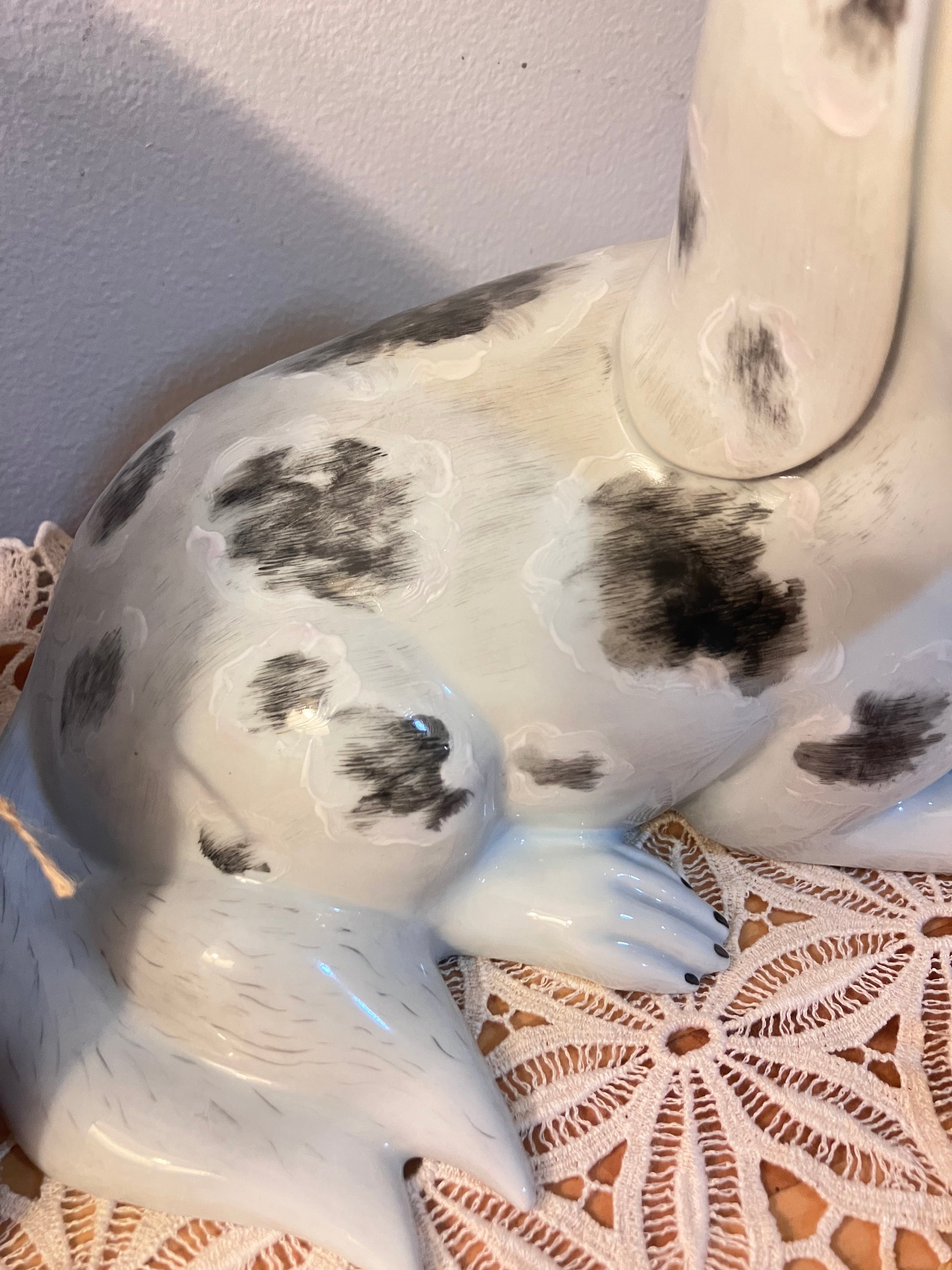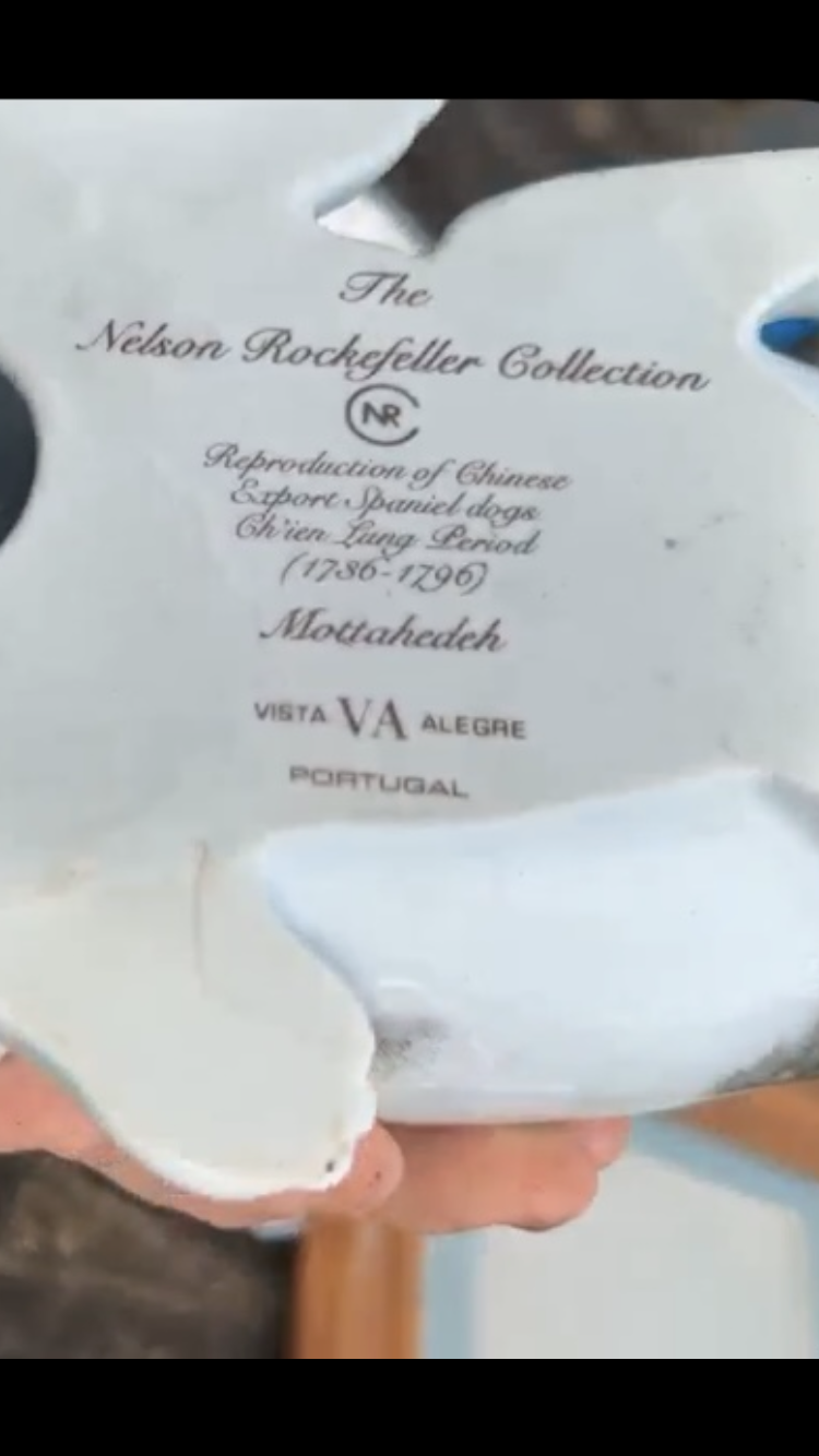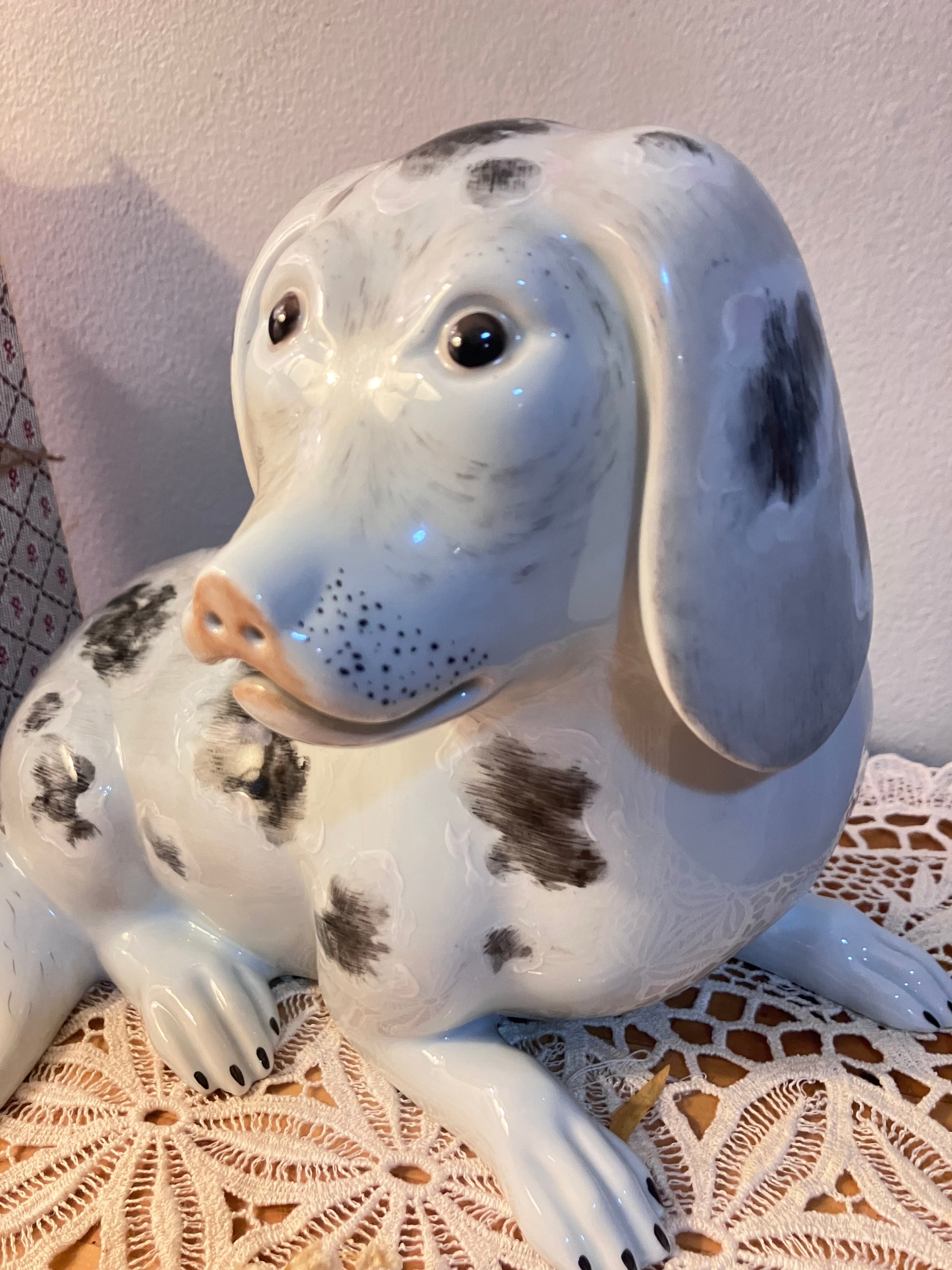 RARE FIND - This porcelain spaniel is a Mottahedeh reproduction of a Chinese Export piece from the Qianlong period (late 18th century). The reproductions were created for the Nelson Rockefeller Collection, in collaboration with Vista Alegre.