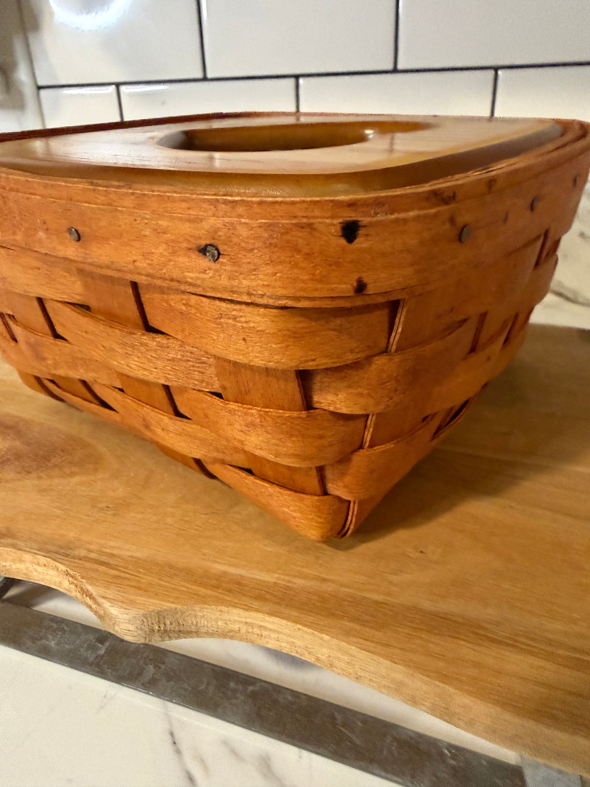 This vintage 1991 Longaberger basket is a charming collectible featuring a heart-shaped cutout on its wooden lid. Handwoven from sturdy maple wood and made in the USA, it comes with its original plastic insert—ideal for holding small items, keeping baked goods fresh, or displaying as a decorative accent.