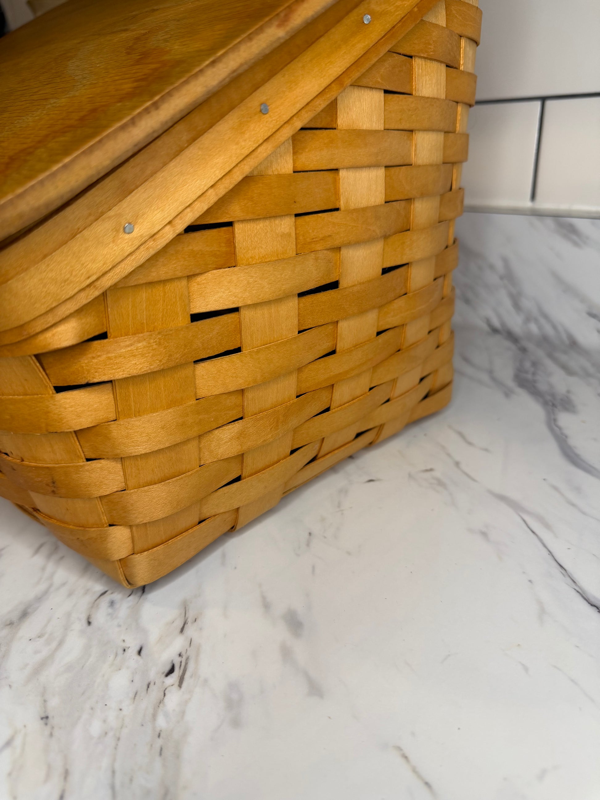 Add a touch of rustic charm to your kitchen or dining space with this vintage Royce Craft bread basket box. Handcrafted with care, this classic piece is perfect for storing bread, baked goods, or even as a decorative display. Its wooden lid keeps contents covered while adding a timeless, natural look.