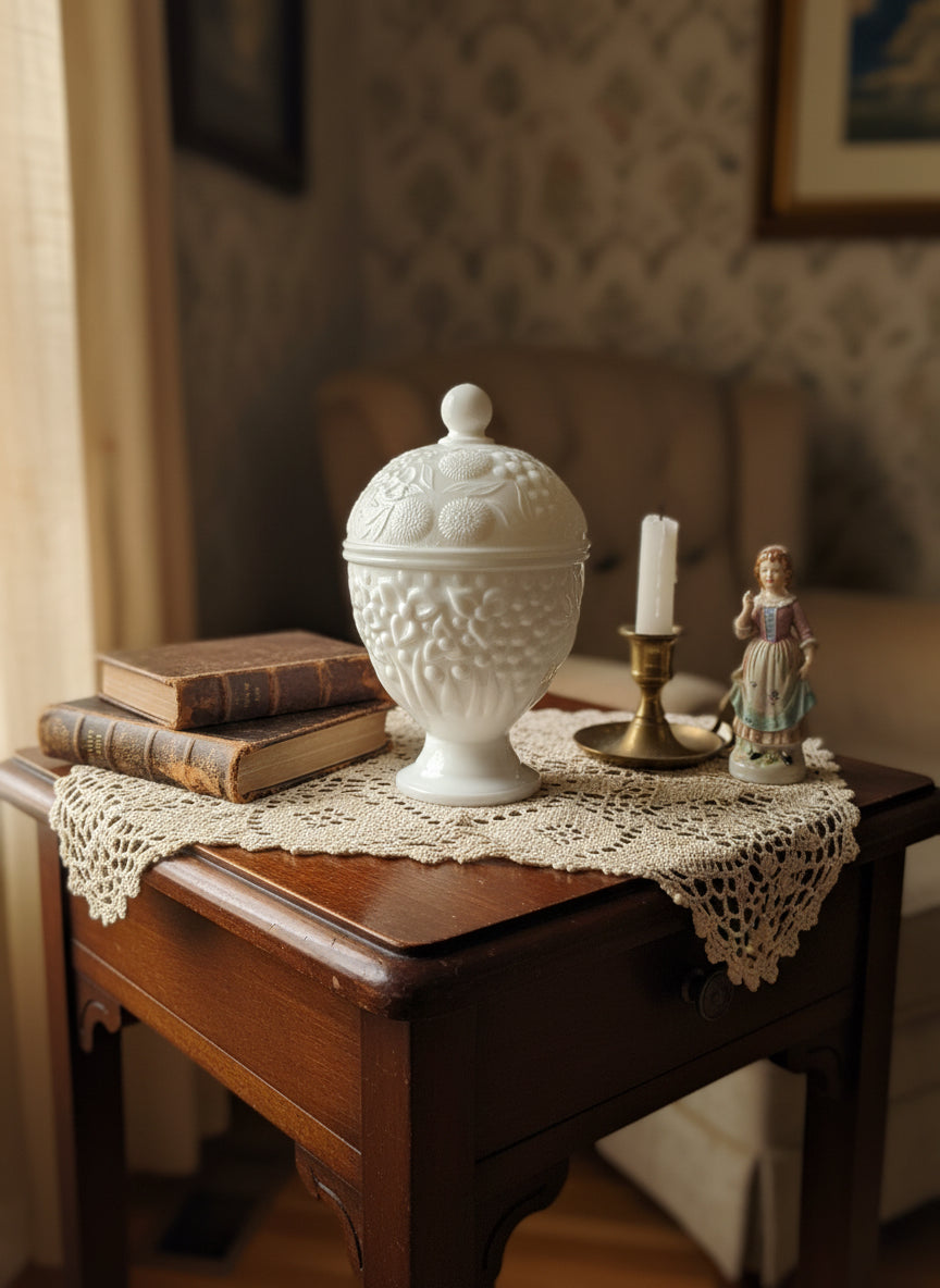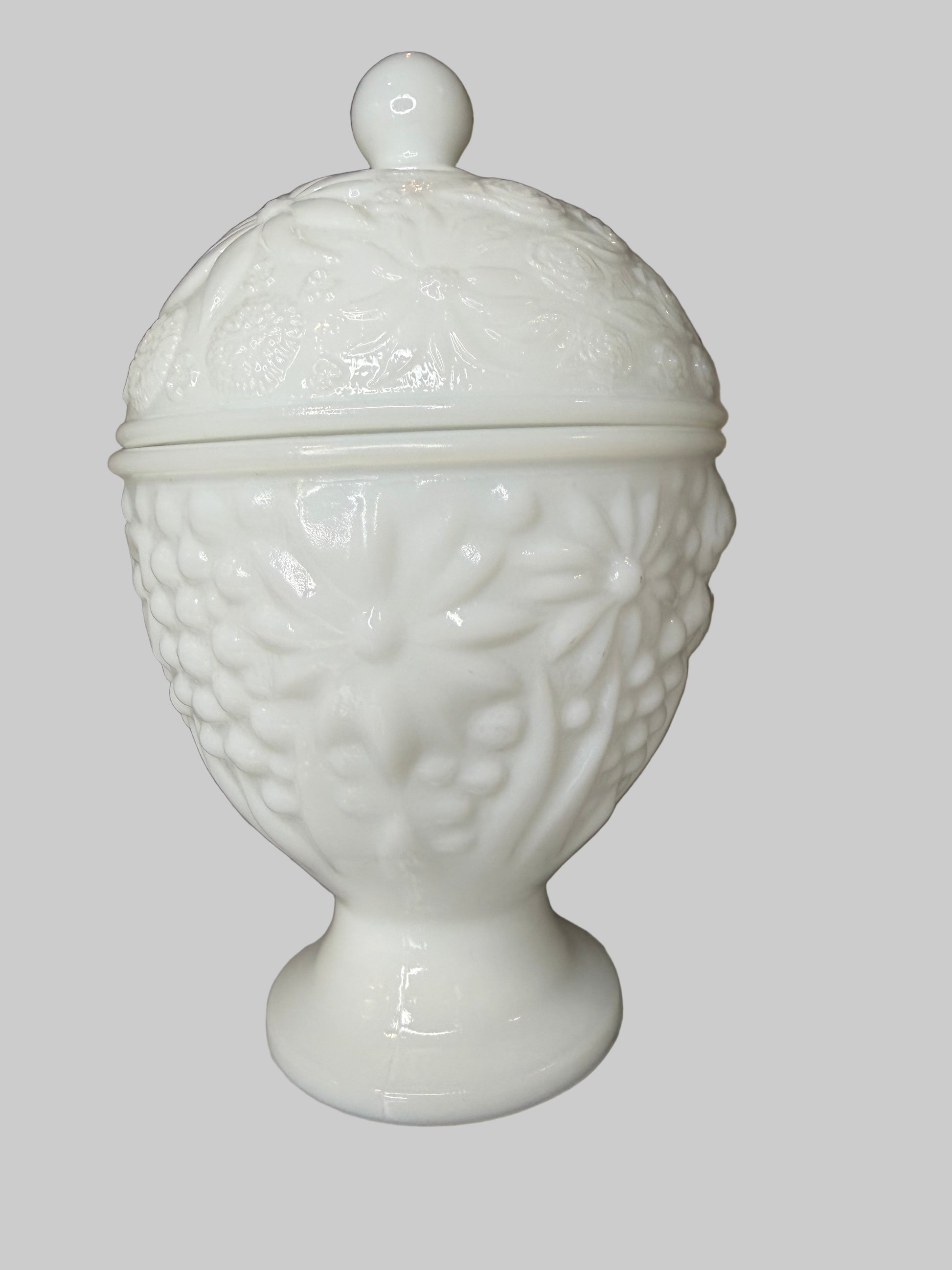 Both the base and lid feature an embossed floral/fruit pattern, adding texture and dimension to the glossy white milk glass. Perfect for storing candies, trinkets, jewelry, or simply displaying as part of your vintage décor collection.