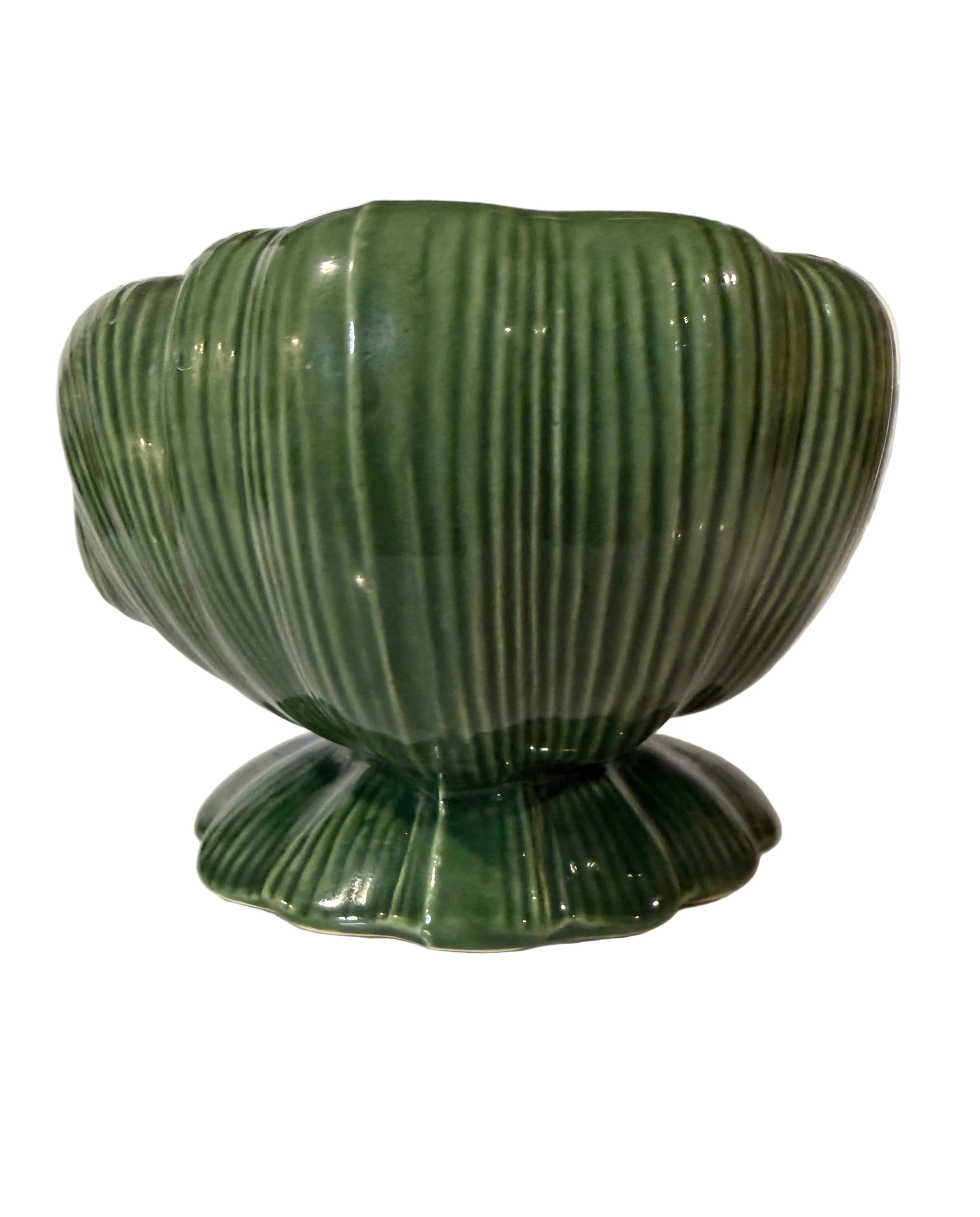 This vintage dark green ceramic planter features a striking shell- or scroll-inspired design that feels both sculptural and timeless. The wavy, ridged texture swirls gracefully along the sides, creating a bold silhouette often associated with Art Deco and mid-century modern decor.