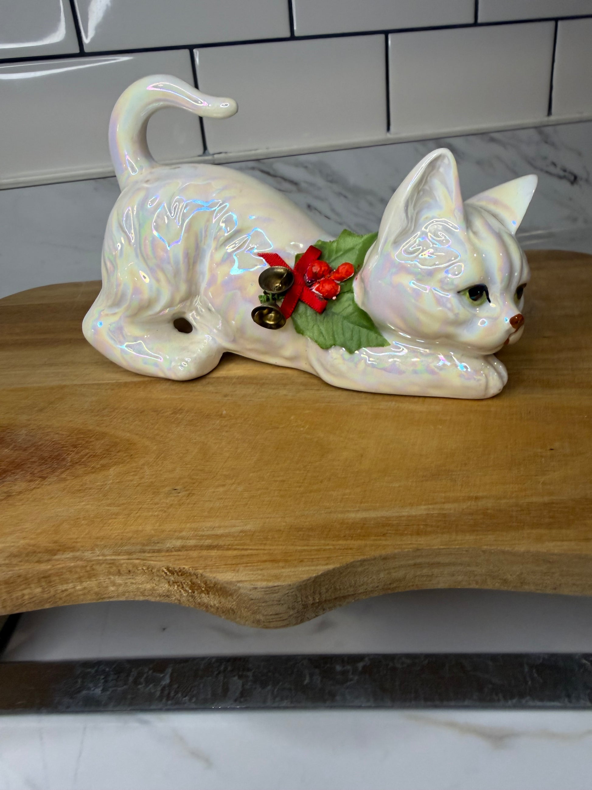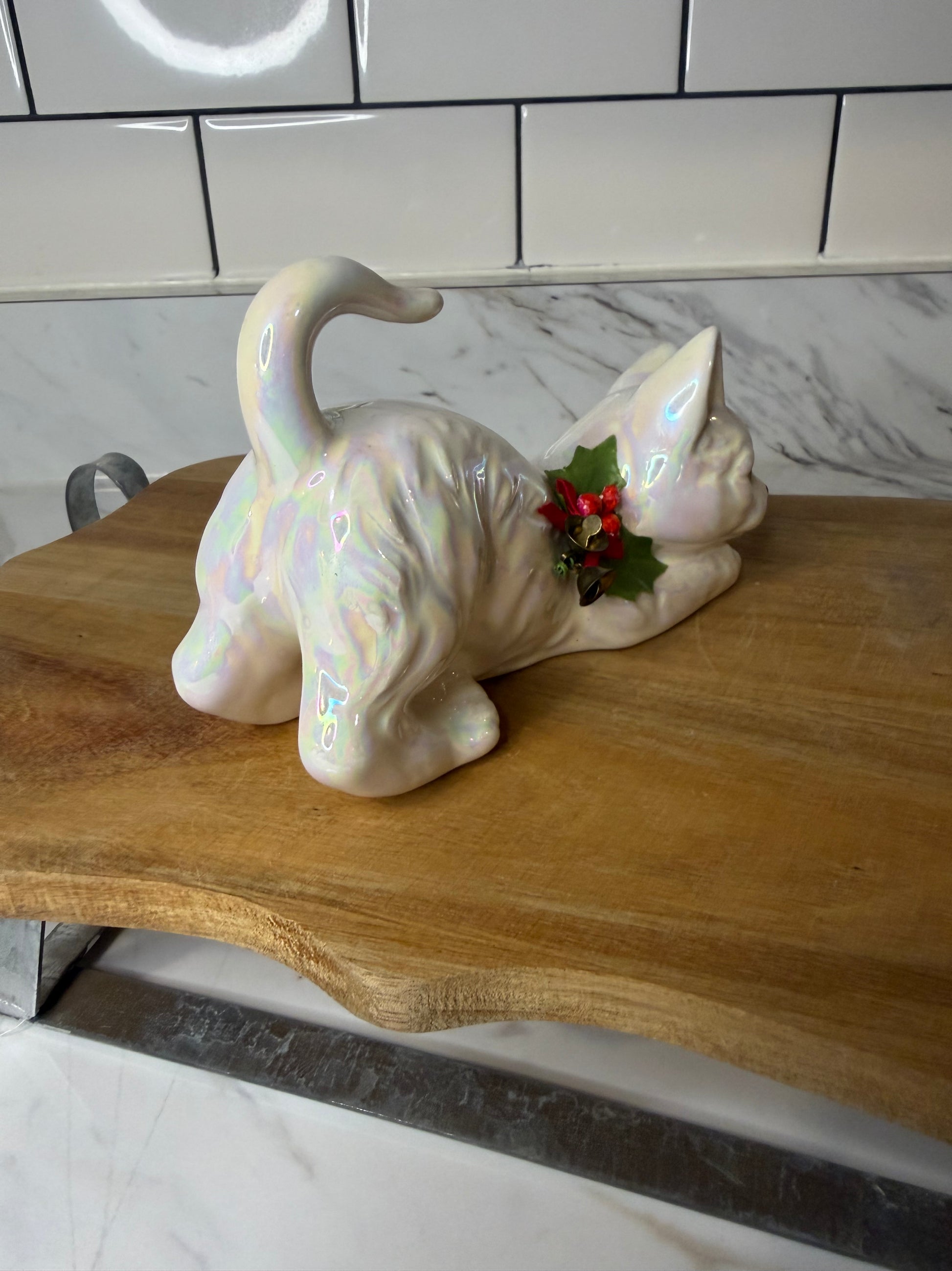 Vintage Enesco Ceramic Christmas Cat Figurine – Iridescent Pearl Finish