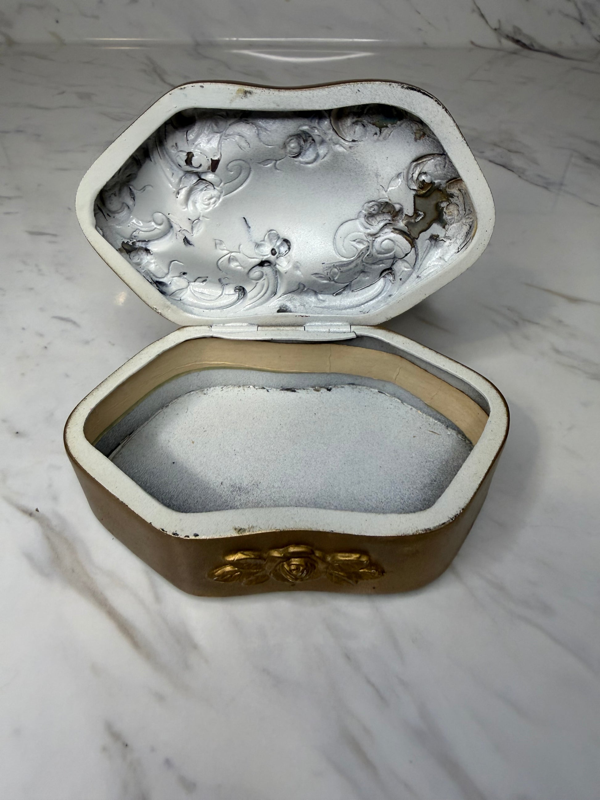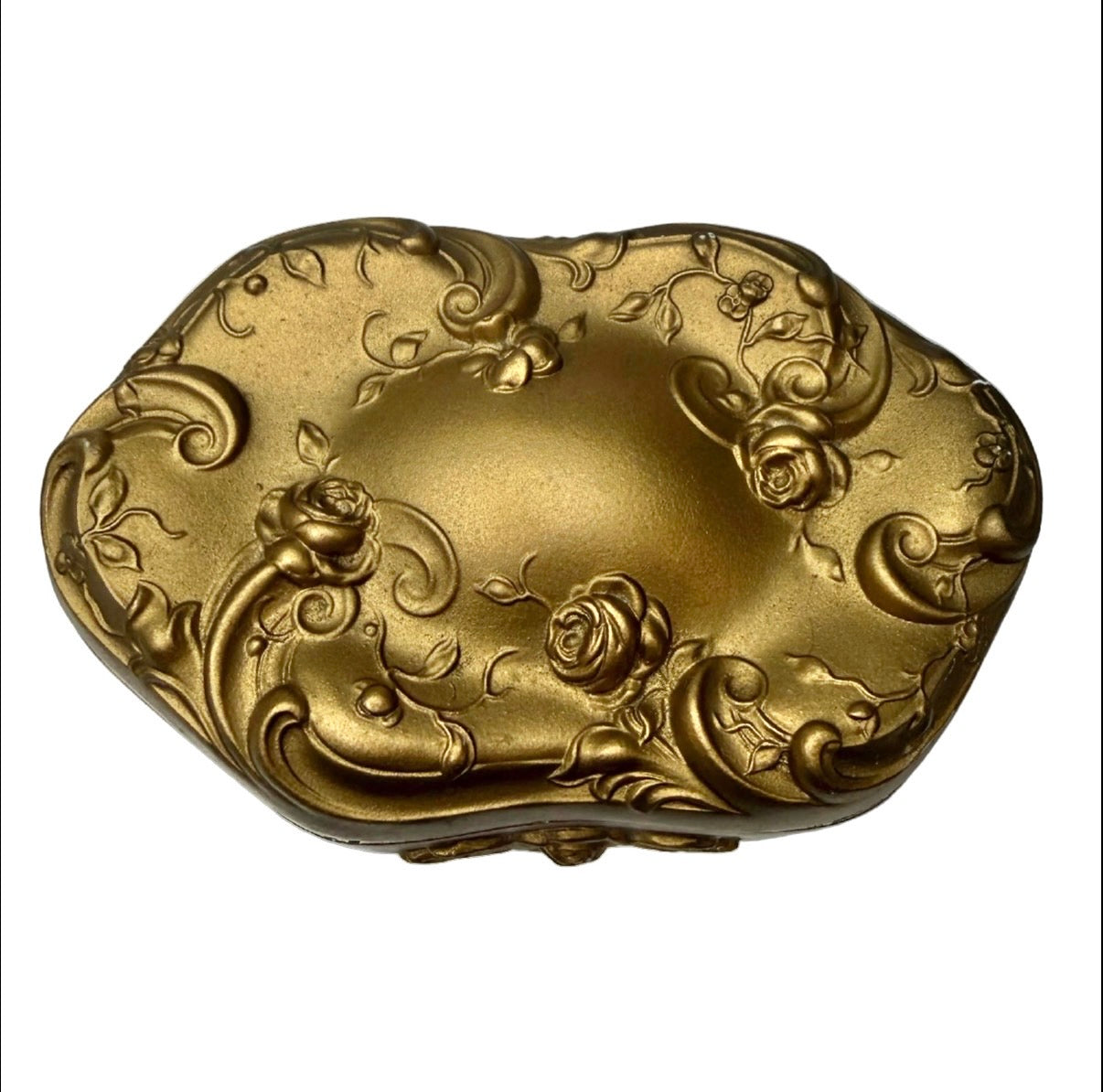 The box features ornate gold-tone floral detailing, with embossed roses adding a delicate, eye-catching touch. Its compact size makes it perfect for rings, earrings, or other small keepsakes.