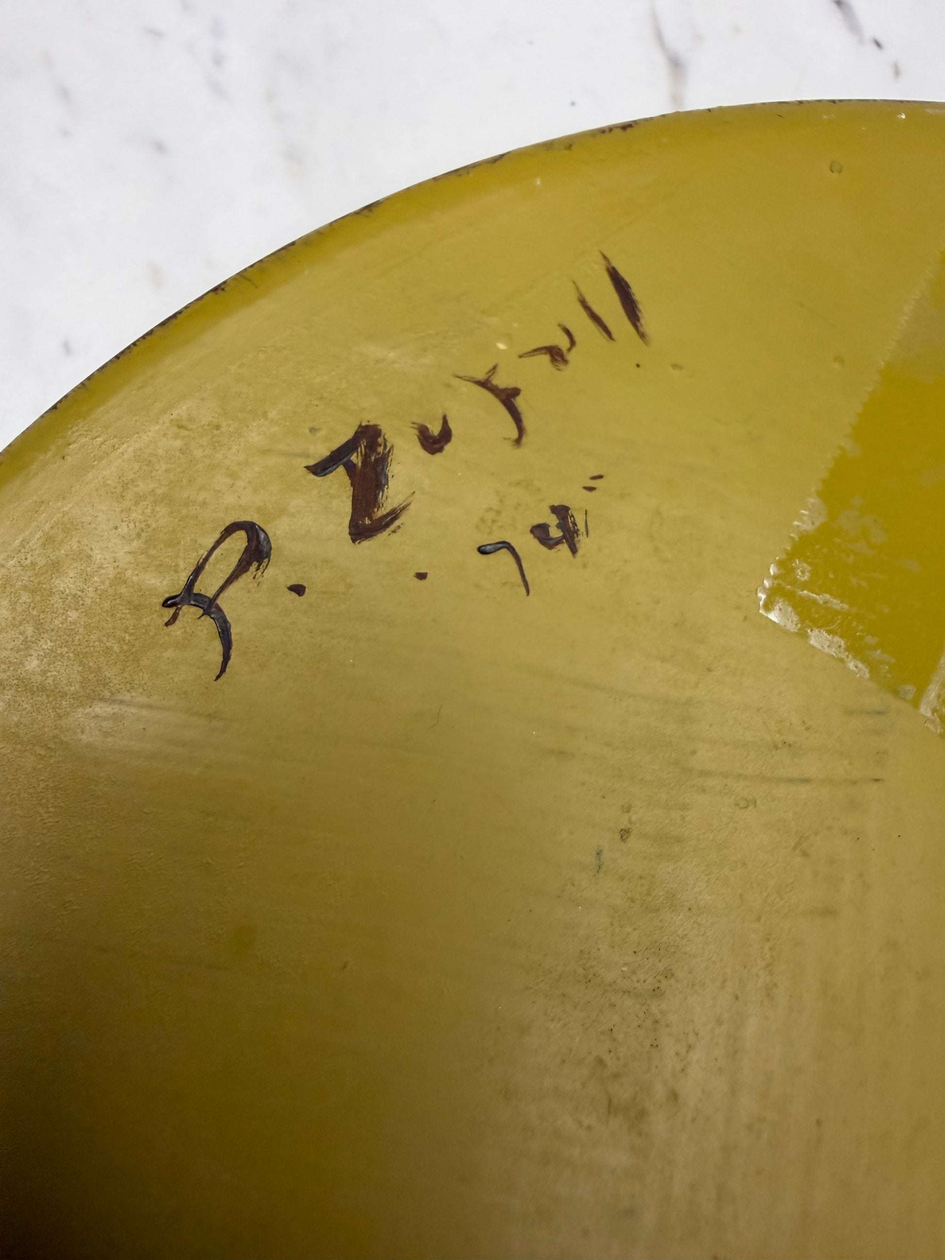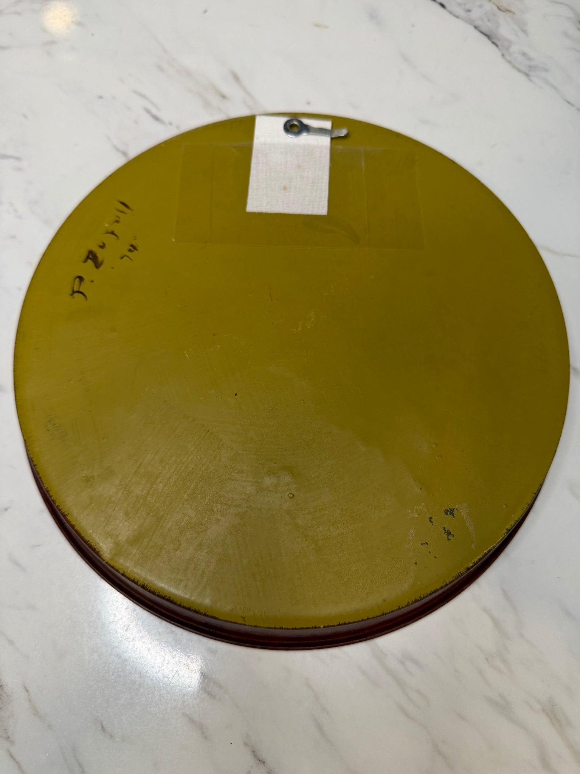 Bring a touch of vintage charm to your home with this hand-painted toleware tray, featuring a classic folk art apple motif. Crafted from metal, this decorative tray showcases two red apples with green leaves set against a light cream background and framed with a delicate border. Signed by the artist in 1974, it embodies the nostalgic charm of mid-century folk art.