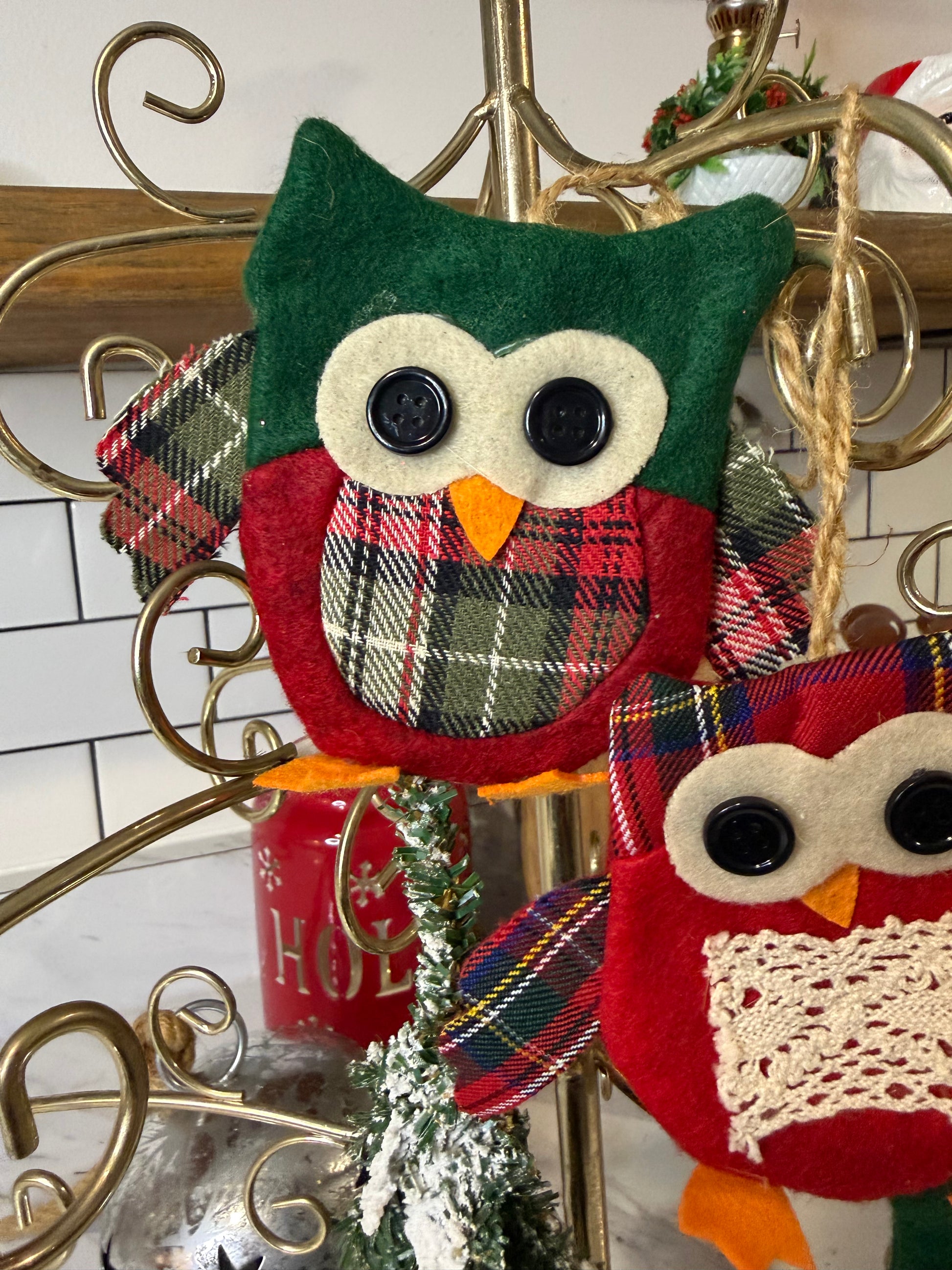 Bring a whimsical, handcrafted touch to your holiday décor with this set of three handmade fabric owl ornaments! Each owl features charming button eyes and is made from colorful, festive fabrics, making them a unique addition to your tree, mantel, or seasonal display. Perfect as a gift or to add a cozy, handcrafted feel to your holiday decorations.