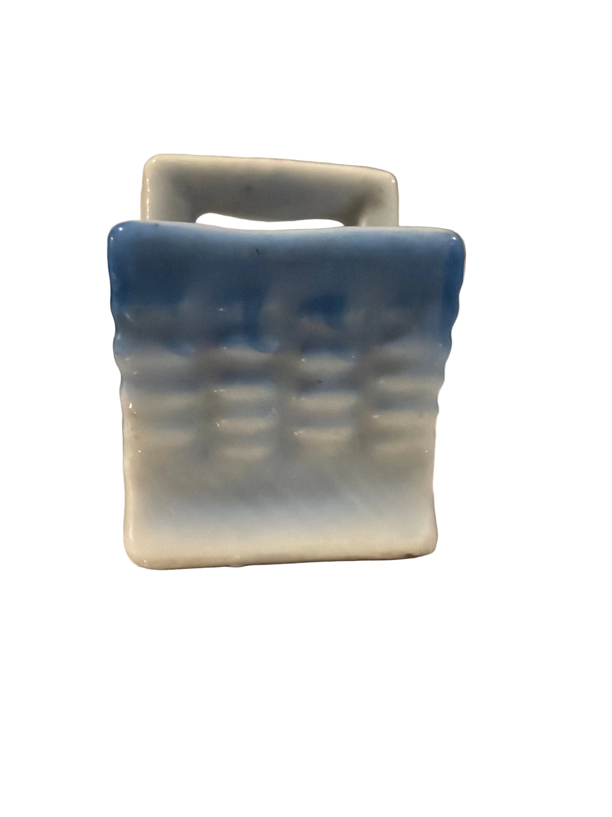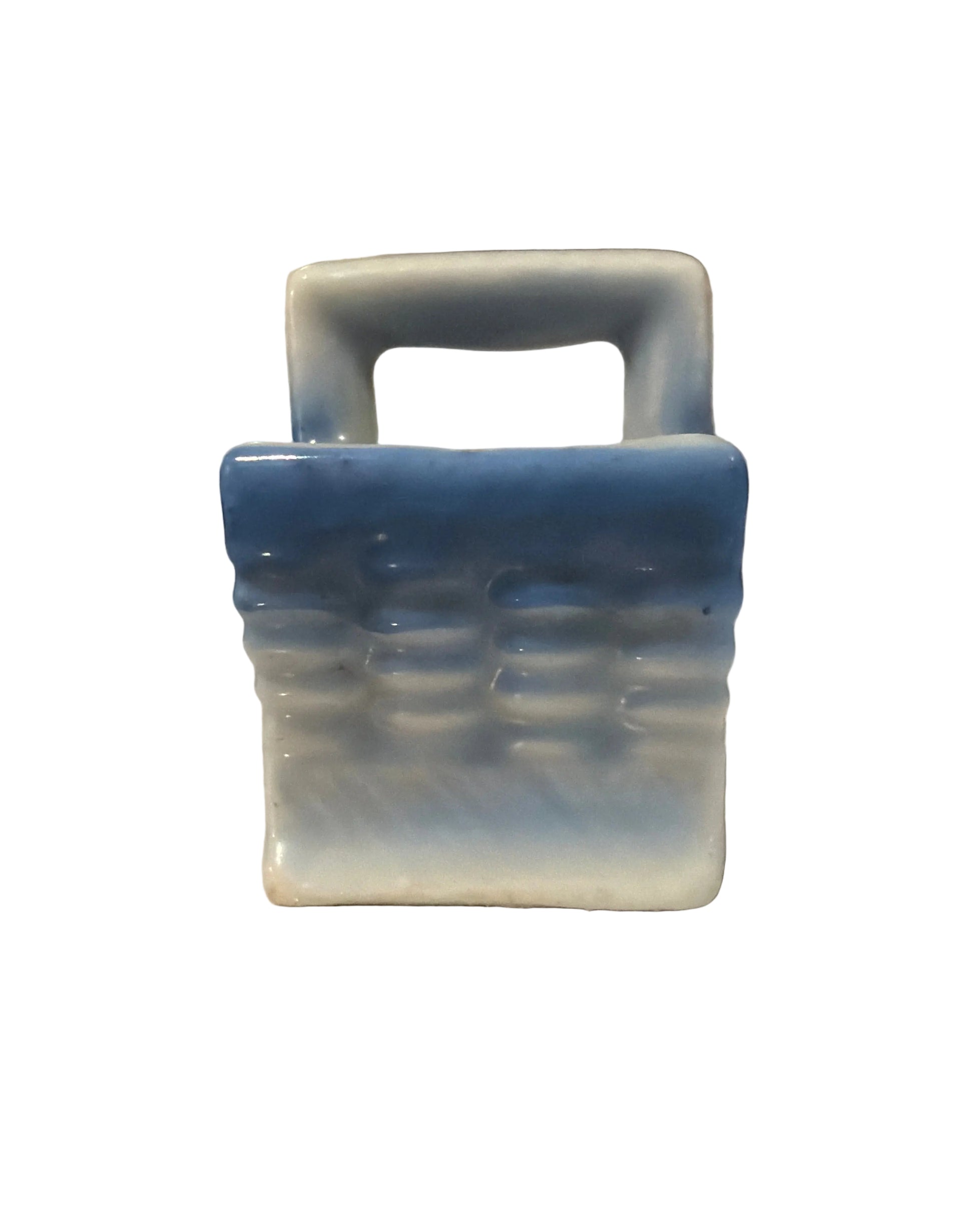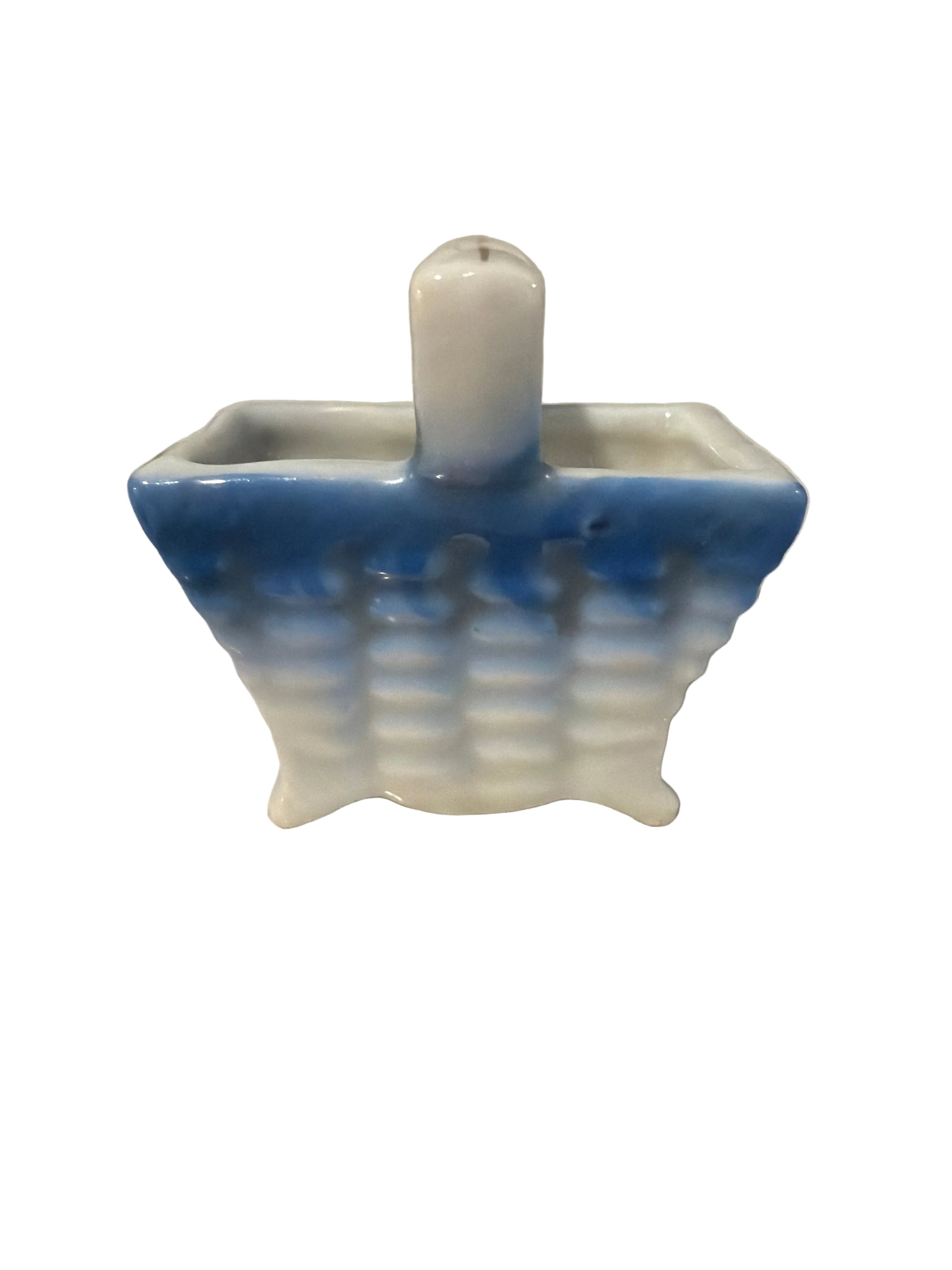 This vintage Isco miniature porcelain basket is a charming example of mid-century Japanese craftsmanship. Likely dating to the mid-1950s, the basket stands approximately 2 inches tall and features a white porcelain base with softly fading blue coloring. Hand-painted details add to its delicate appeal, making it a lovely addition to a miniature collection, curio shelf, or vintage display.