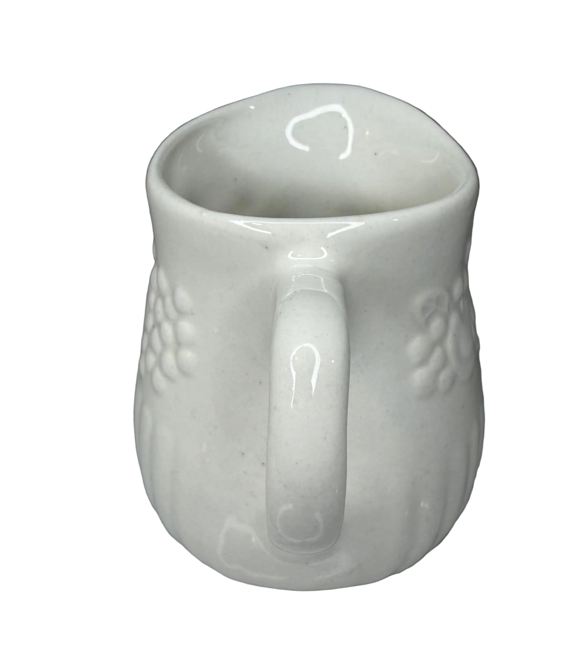Add a touch of vintage charm to your table with this classic Libbey white ceramic creamer. Likely from the 1970s, it features an elegant embossed fruit and grape pattern, perfect for collectors or for adding a nostalgic feel to your kitchen décor.