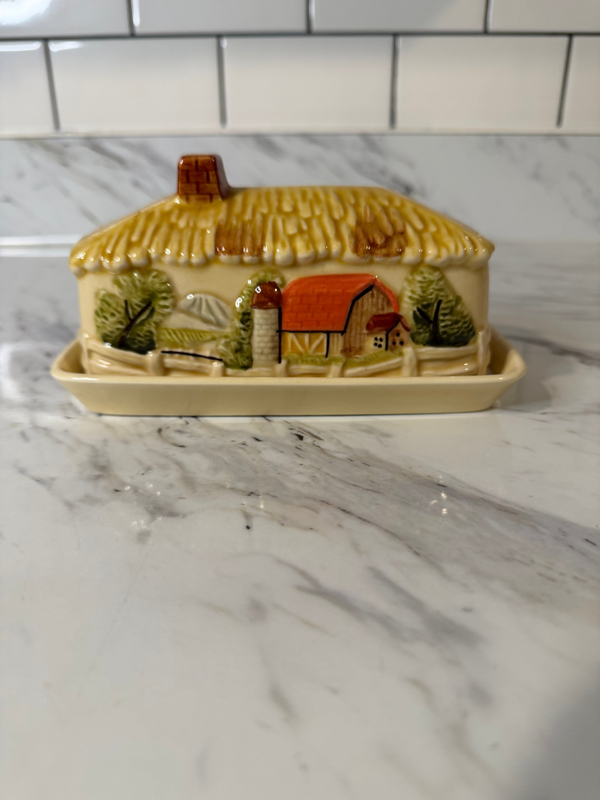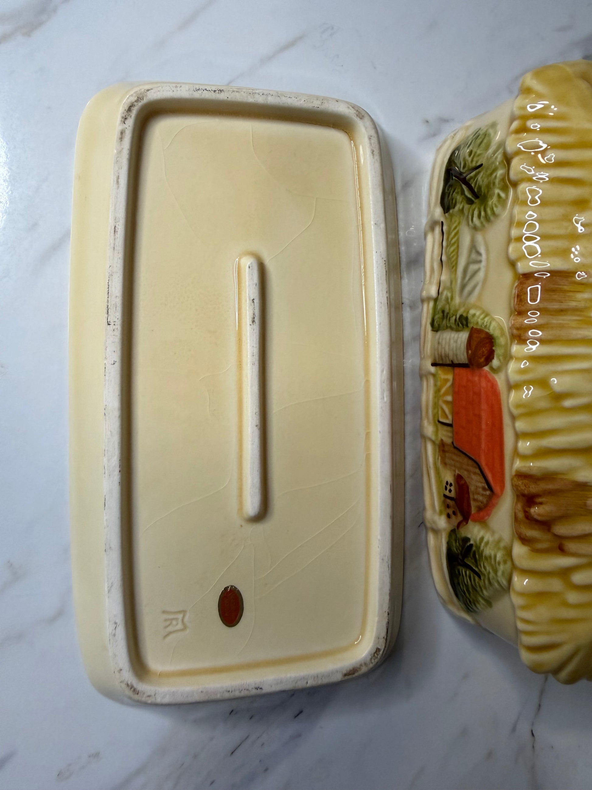 Bring cottage charm to your kitchen with this delightful vintage Marks & Rosenfeld Cottageware butter dish. Featuring a whimsical farmhouse cottage design with a textured thatched roof, this covered dish is both decorative and functional — perfect for serving butter at the table or displaying as part of your vintage kitchen collection.