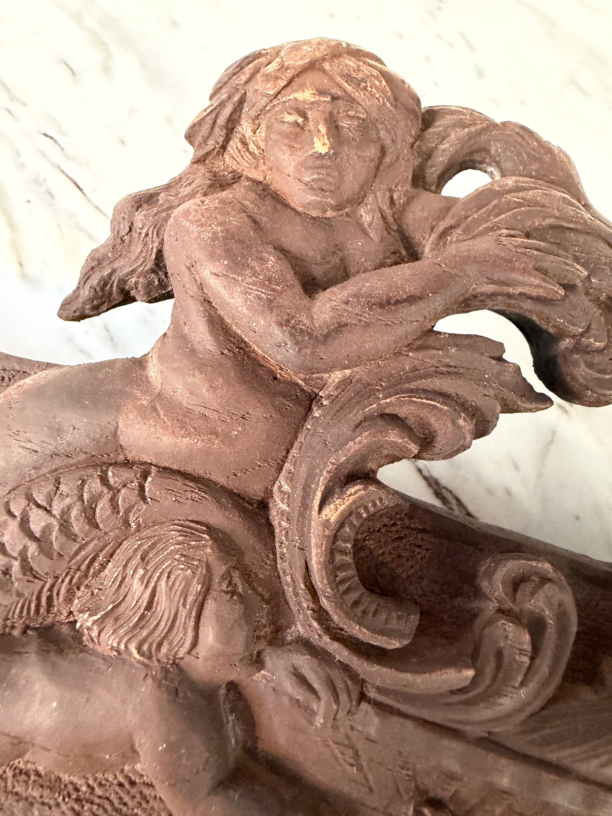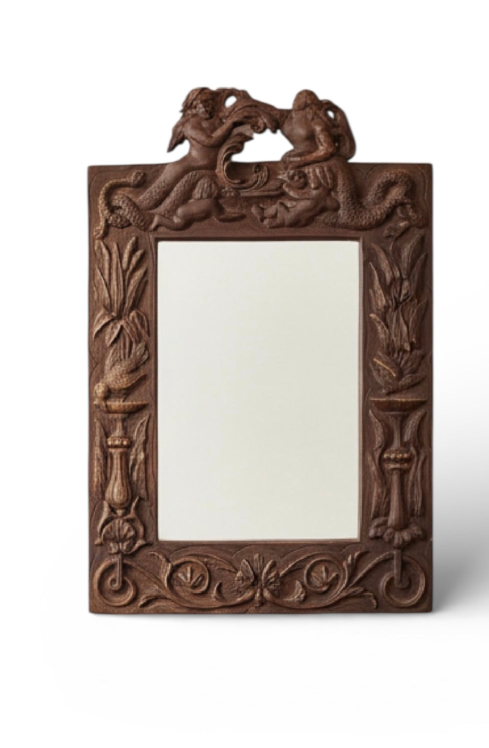 Elevate your space with this vintage wall mirror from Gargoyles Studio Fine Reproductions, a Brooklyn-based studio renowned for high-quality plaster and chalkware recreations of antique decorative pieces. This mirror features an intricate frame with whimsical mermaids, cherubs, and sea creatures, capturing the charm of Gothic, Neoclassical, and Baroque-inspired designs.