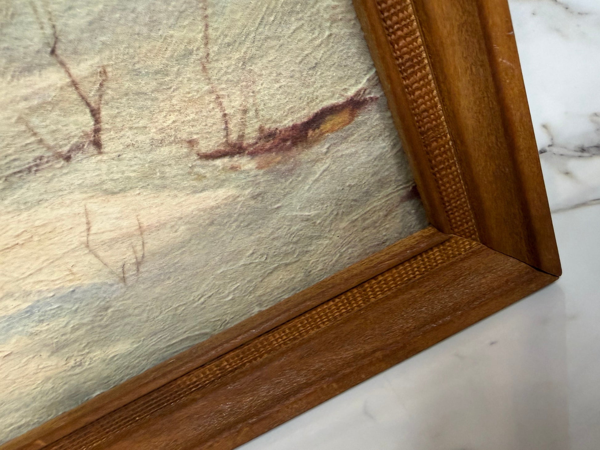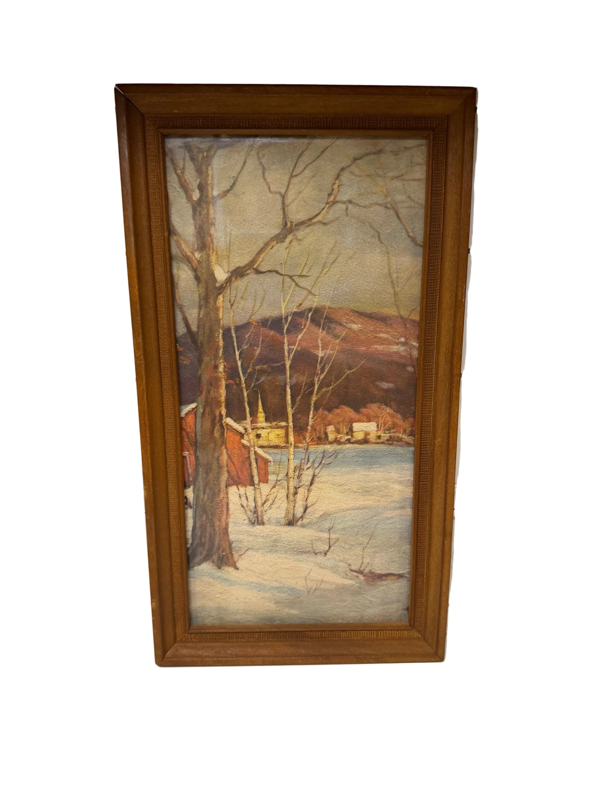 This vintage textured print is a reproduction of “Snow in the Catskills” by renowned American landscape artist Robert William Wood (1889–1979), celebrated for his romantic and realistic depictions of the American countryside.