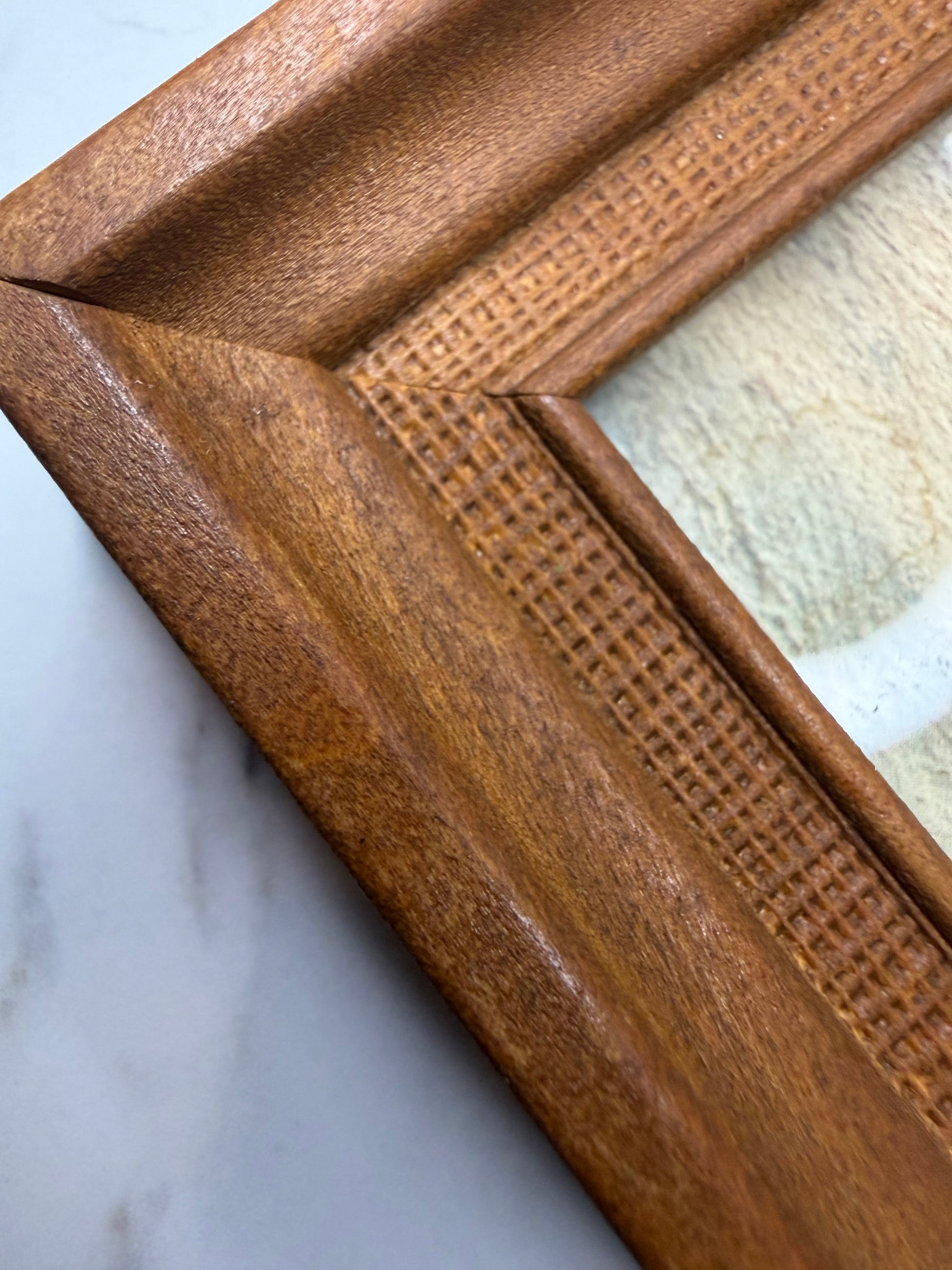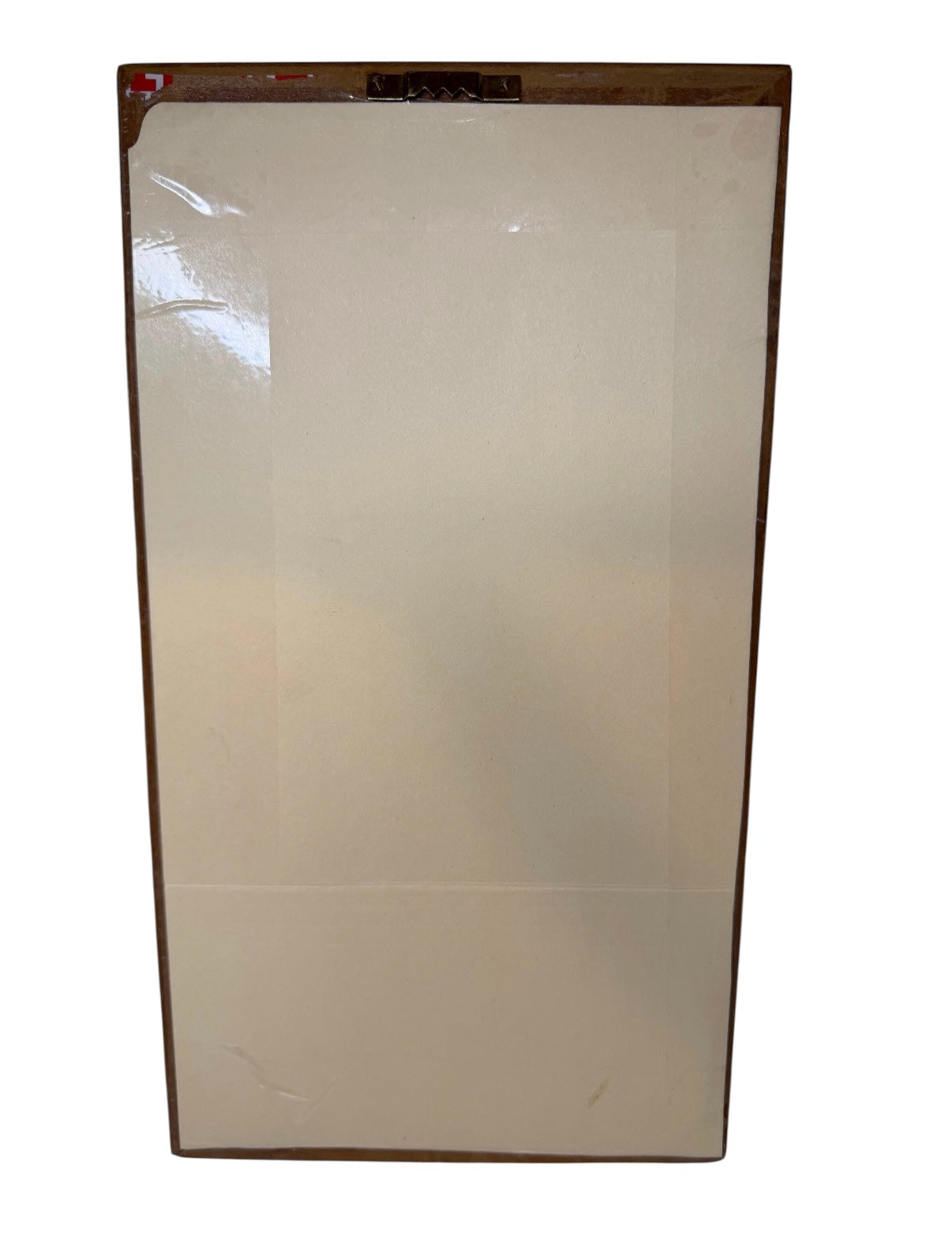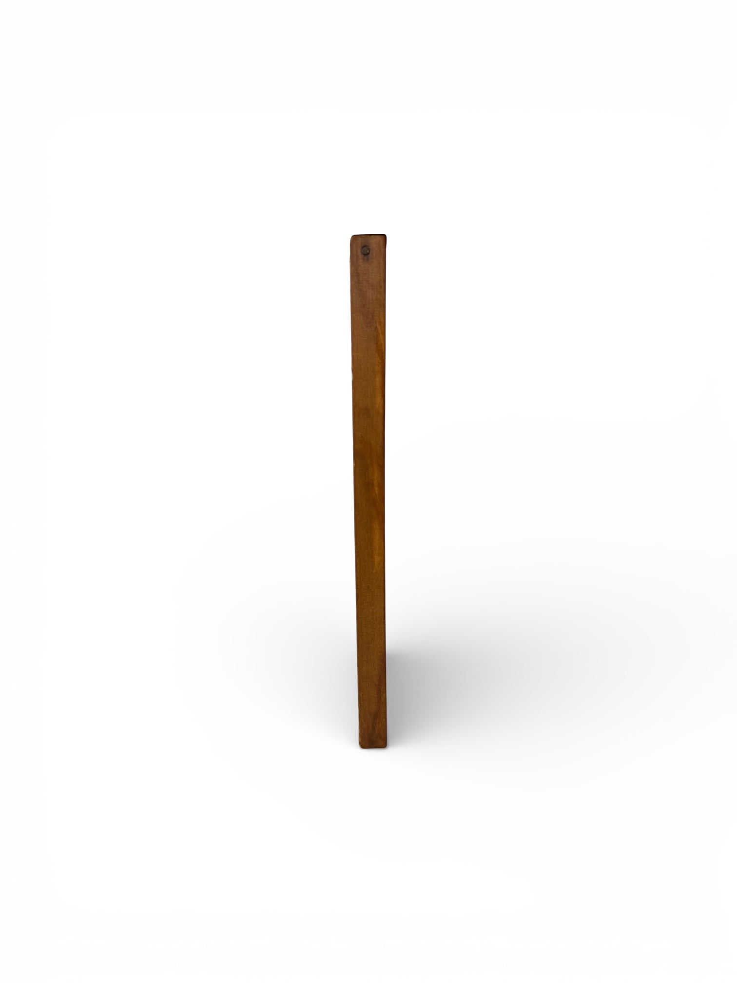 The narrow vertical wooden frame adds to its authentic mid-century character.