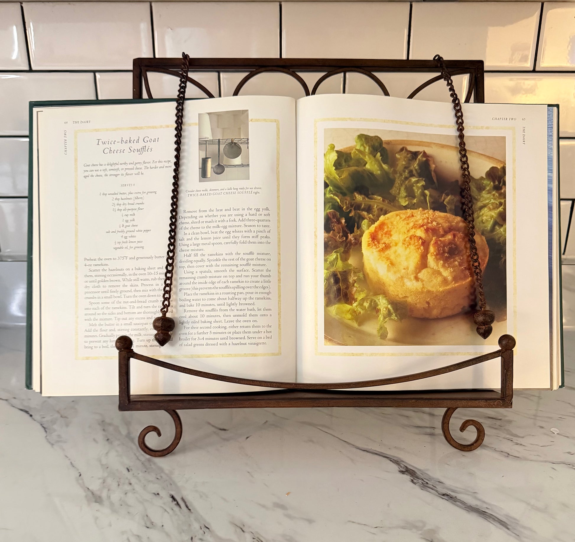 This vintage cookbook stand is both functional and decorative. Designed to hold cookbooks, recipes, or tablets upright, it saves counter space and keeps your pages easily readable while you cook.