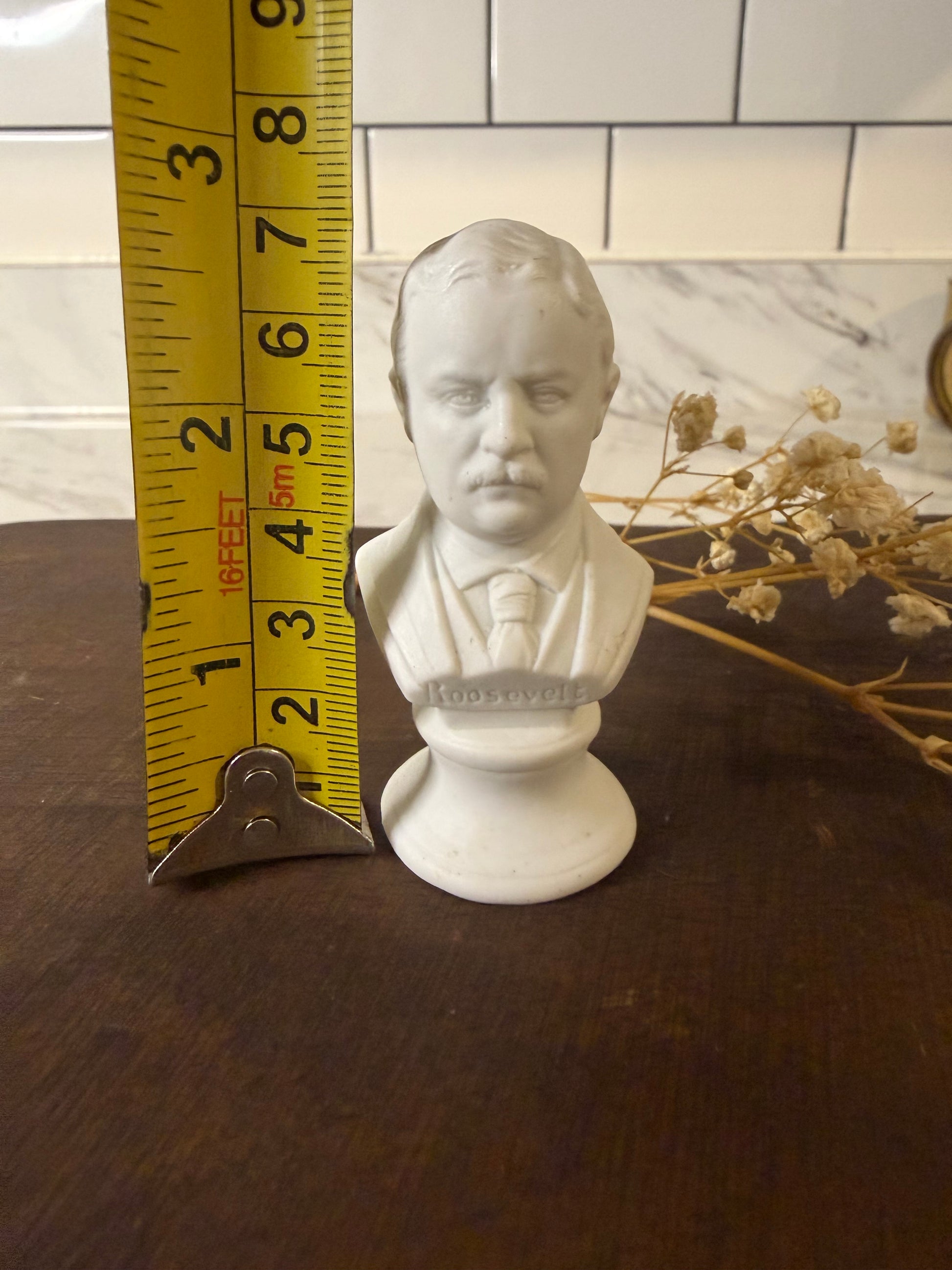 This is a charming vintage miniature bust of Theodore Roosevelt, crafted in white bisque-style ceramic. Measuring approximately 2.5 inches tall, this small decorative piece captures Roosevelt’s iconic mustache, strong features, and early 1900s style.