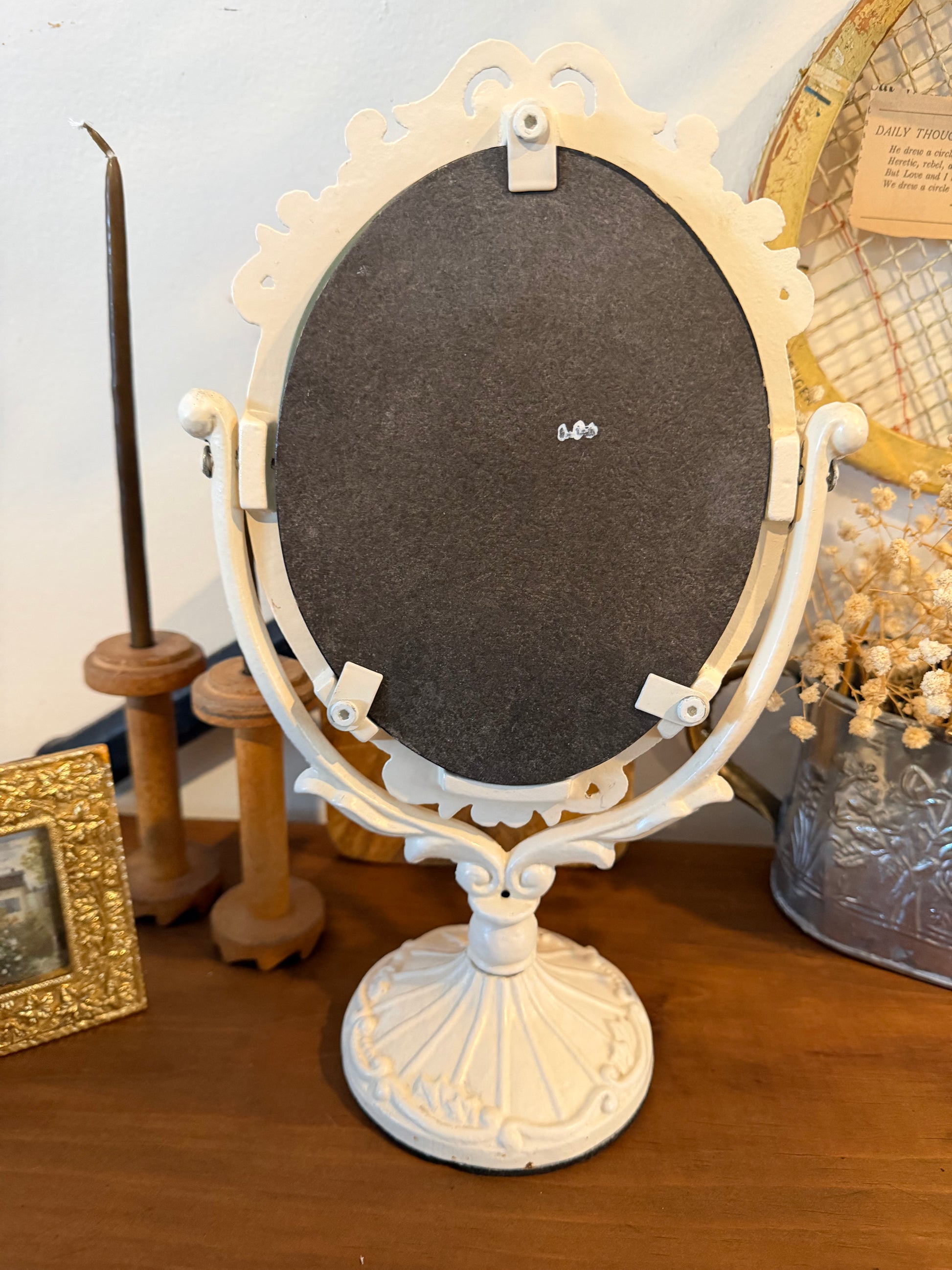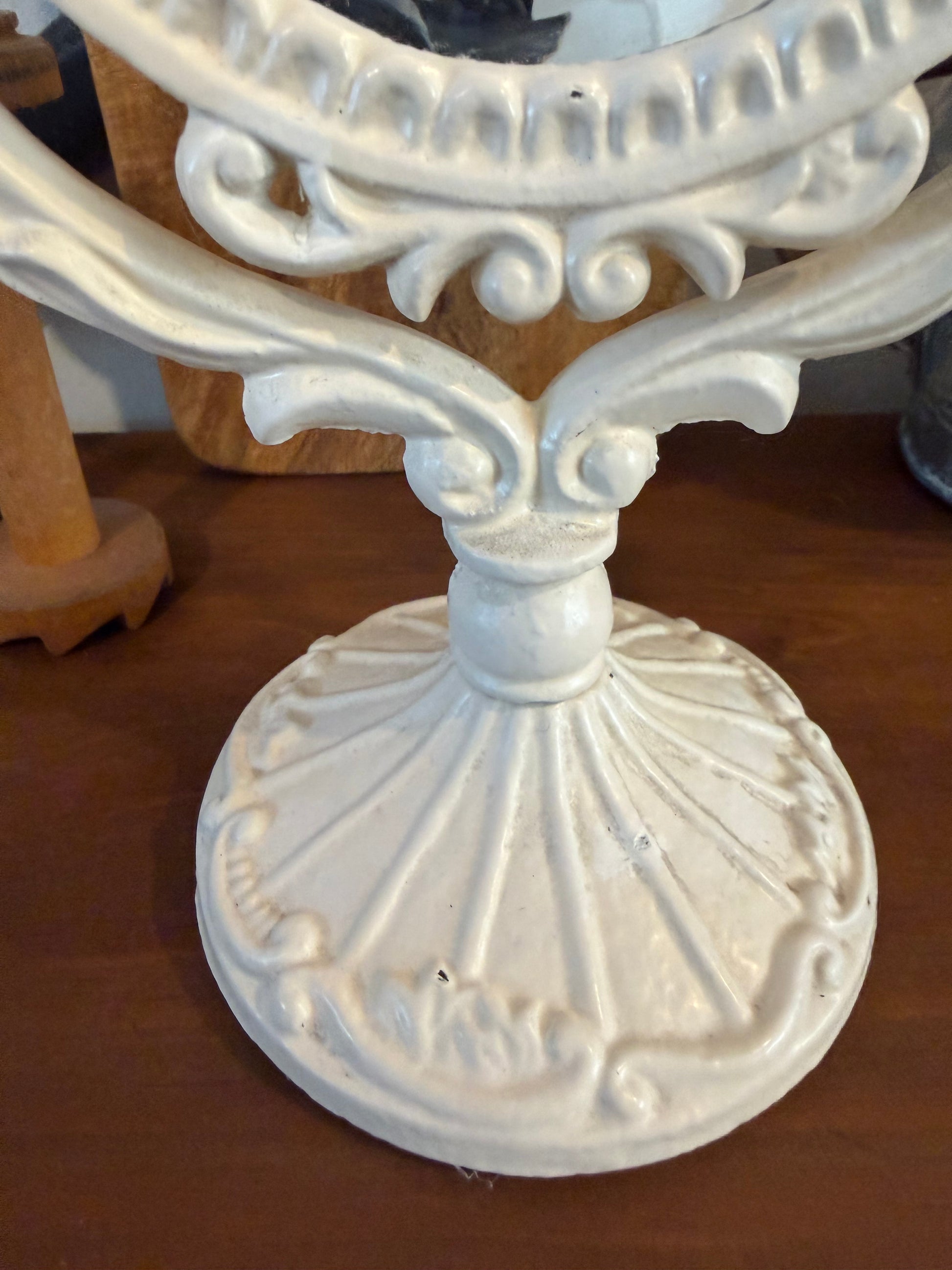 Vintage Victorian-Style Vanity Mirror – White Painted Cast Iron, Shabby Chic Pedestal