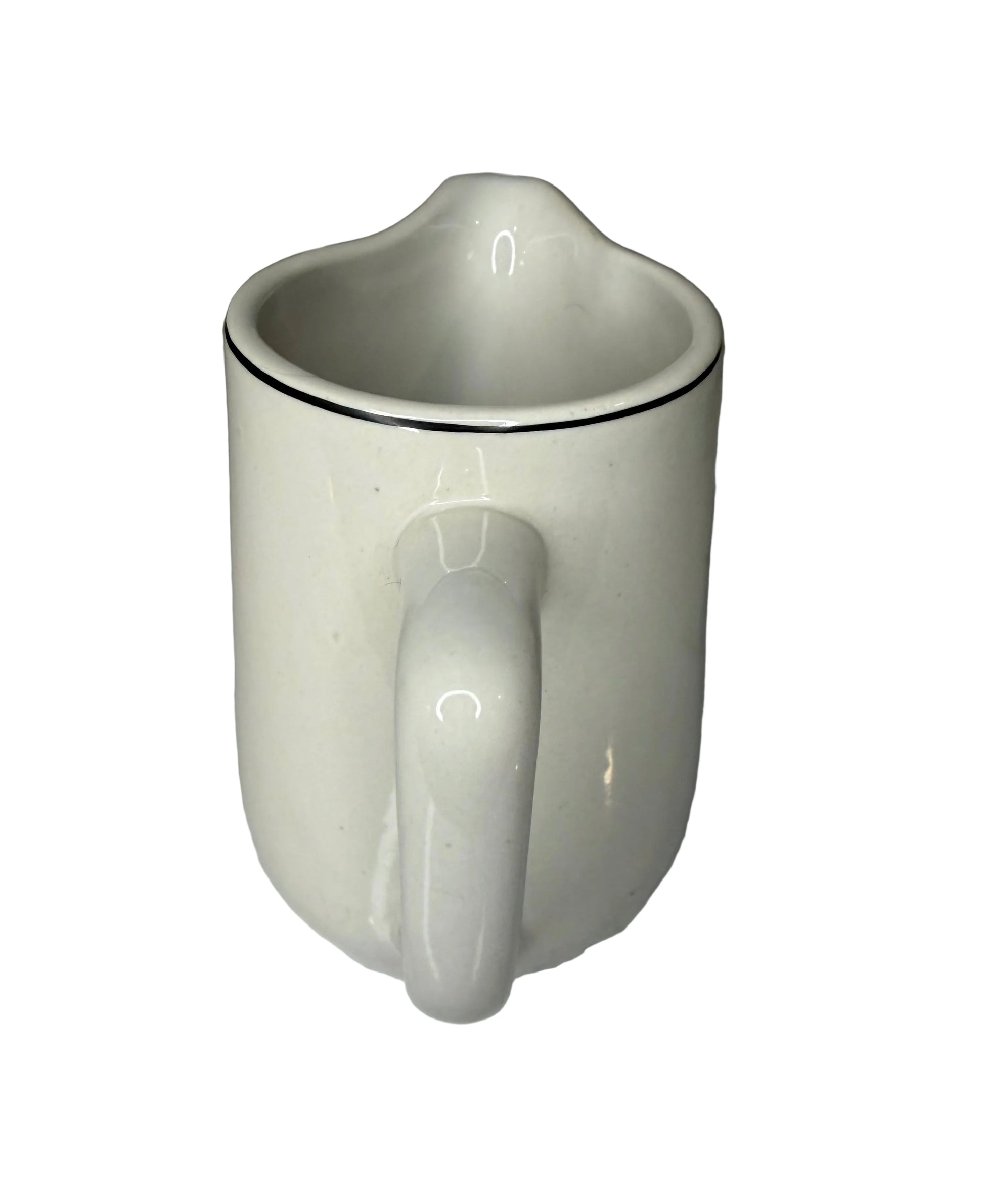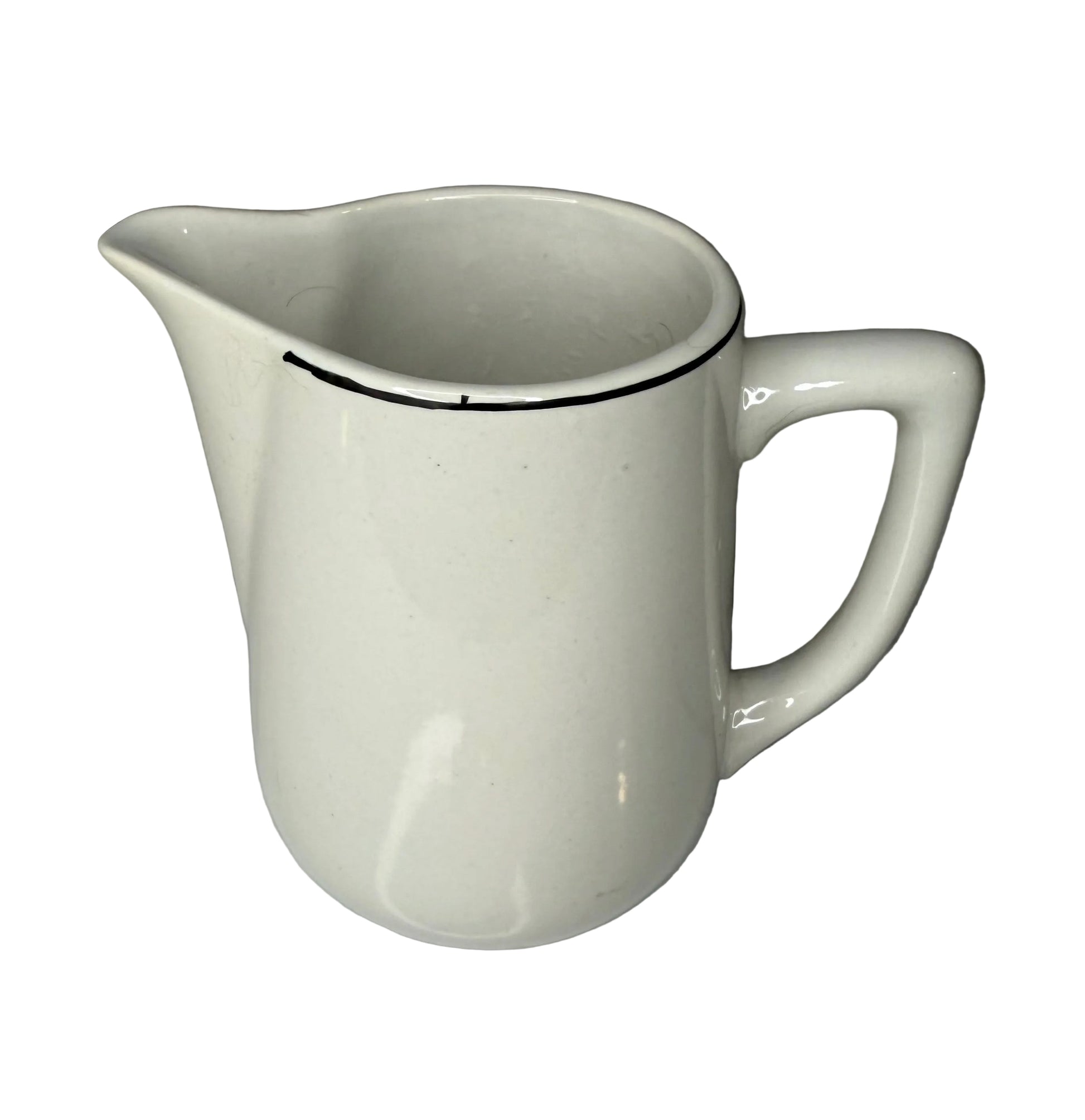 Add a touch of classic charm to your table with this vintage white restaurant ware creamer pitcher. Though unmarked, this piece is typical of durable functional porcelain produced by makers like Syracuse China or Shenango. Its clean, simple design is highlighted by a single thin decorative band—often platinum or black—around the rim and handle.