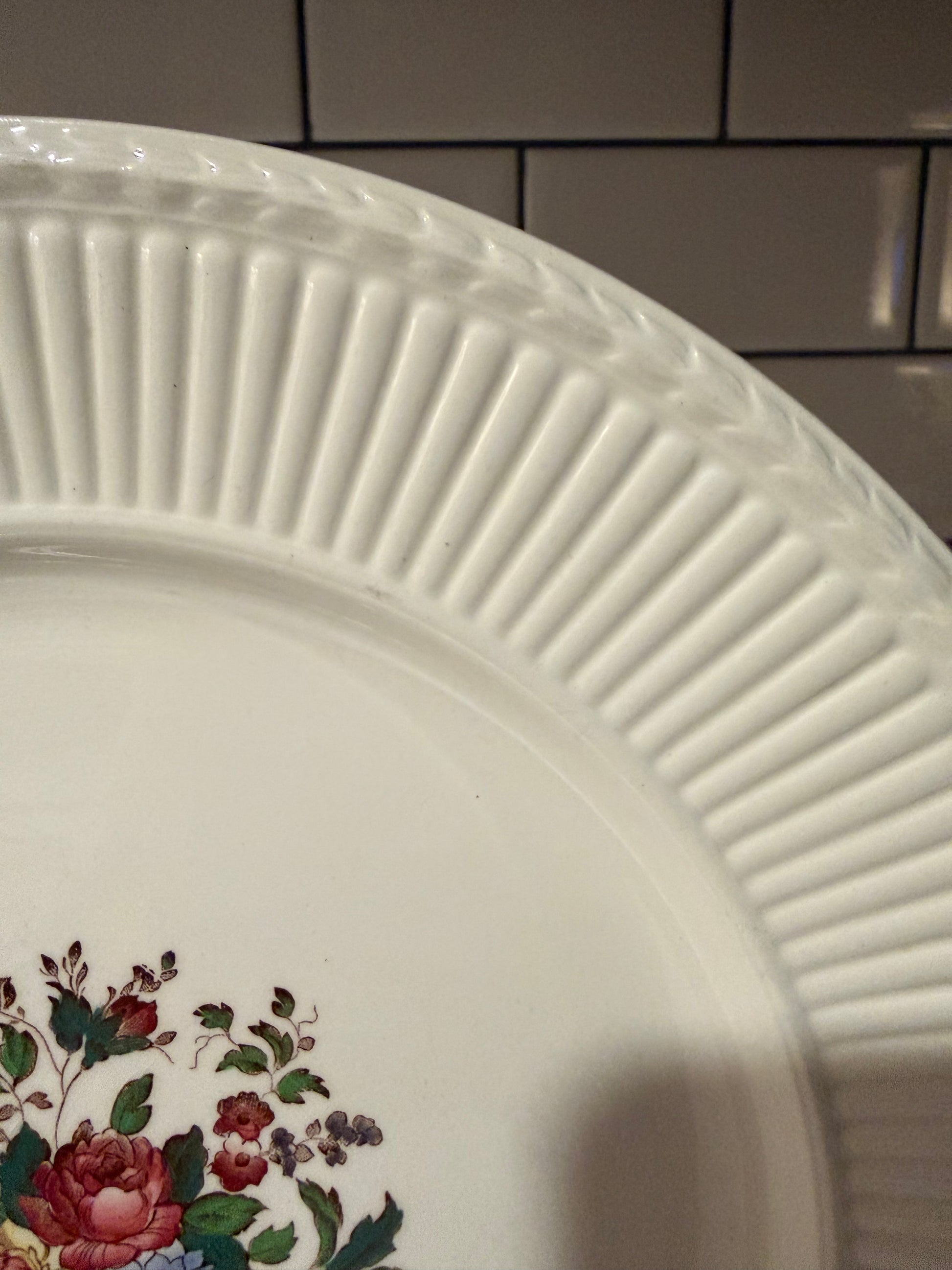 A timeless piece of English ceramics, this vintage Wedgwood Conway plate features a delicate floral bouquet motif centered on the plate. The design is set on Wedgwood’s classic Edme shape, known for its refined ribbed edge that adds subtle texture and elegance.