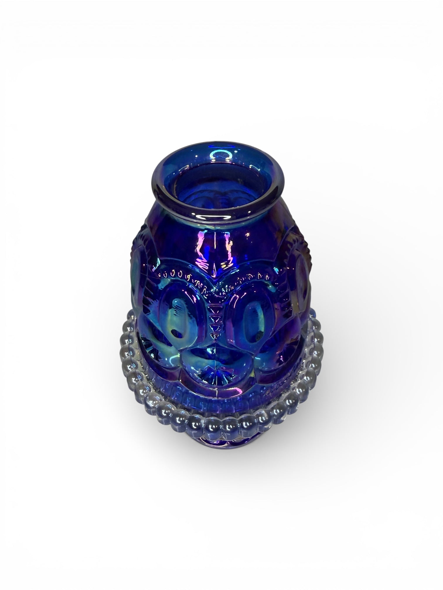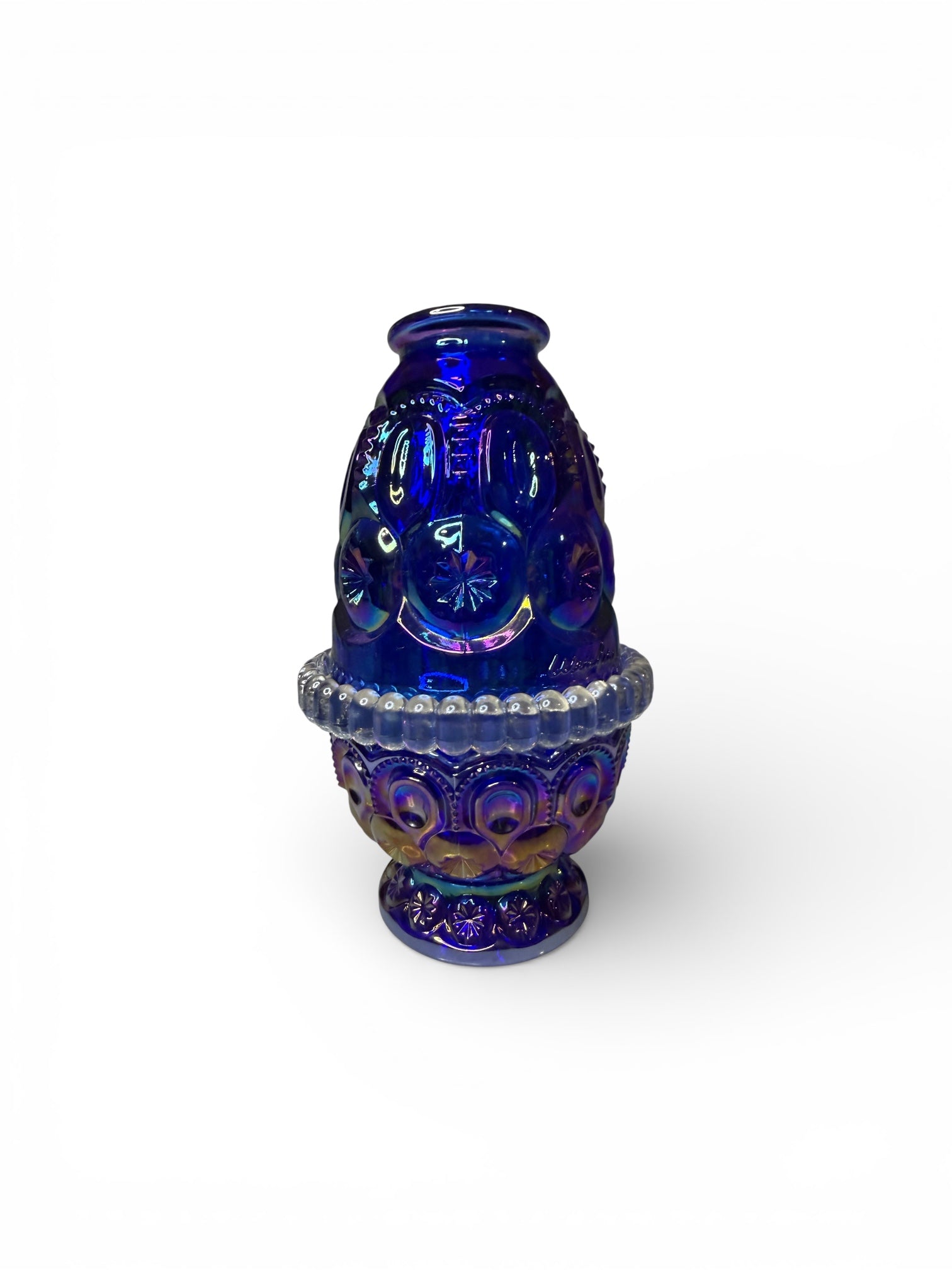 Add a touch of vintage glow to your space with this beautiful Weishar Moon & Star fairy lamp in rich cobalt blue carnival glass. Made in the U.S.A., this classic three-piece fairy lamp is both decorative and functional, casting a warm, magical light when illuminated with a candle.