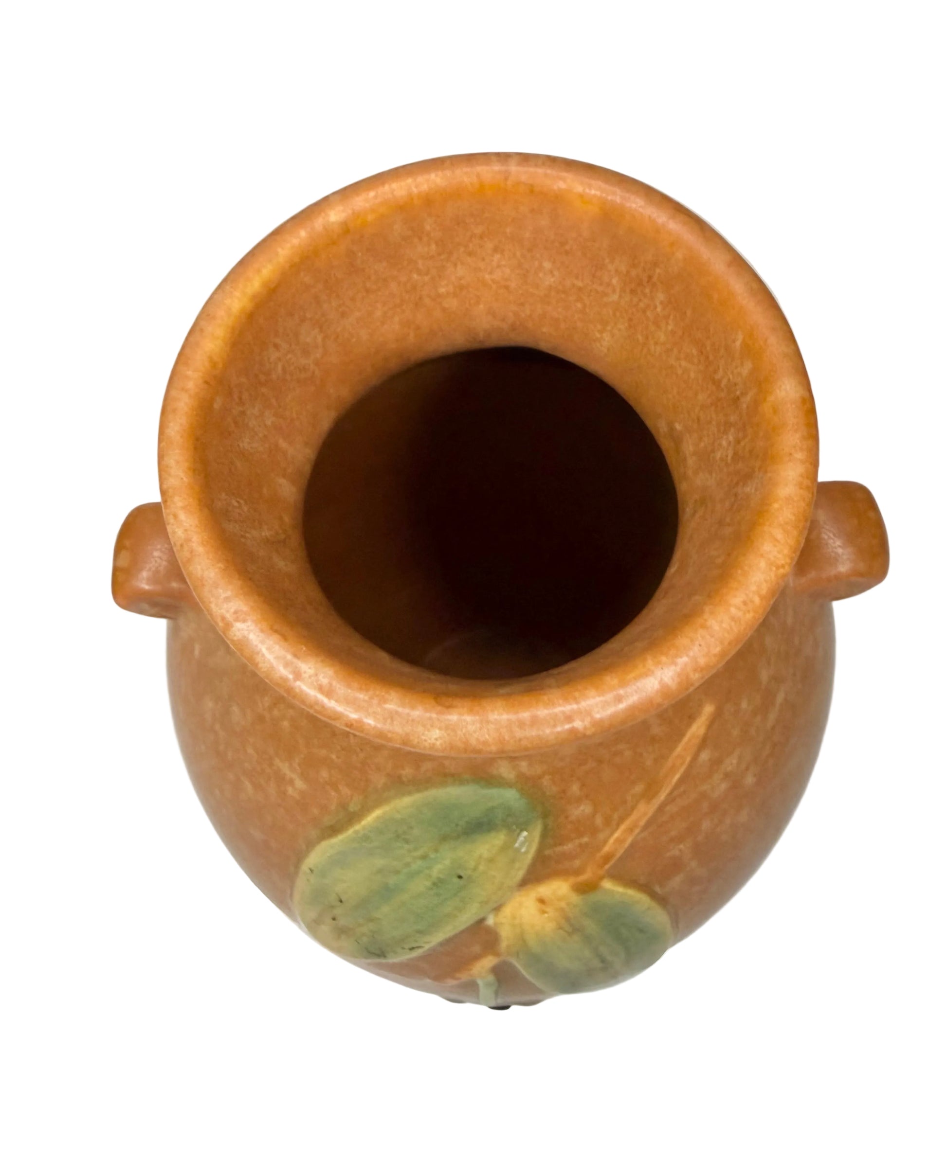 The Cornish line reflects a stunning blend of Art Deco and Arts & Crafts influence, featuring raised embossed leaves and berries against a richly textured, mottled background. This piece showcases Weller’s signature brown/rust-toned glaze, with olive green leaves and deep blue-to-black berries that create depth and contrast. The dimensional detailing gives the vase beautiful visual interest from every angle.