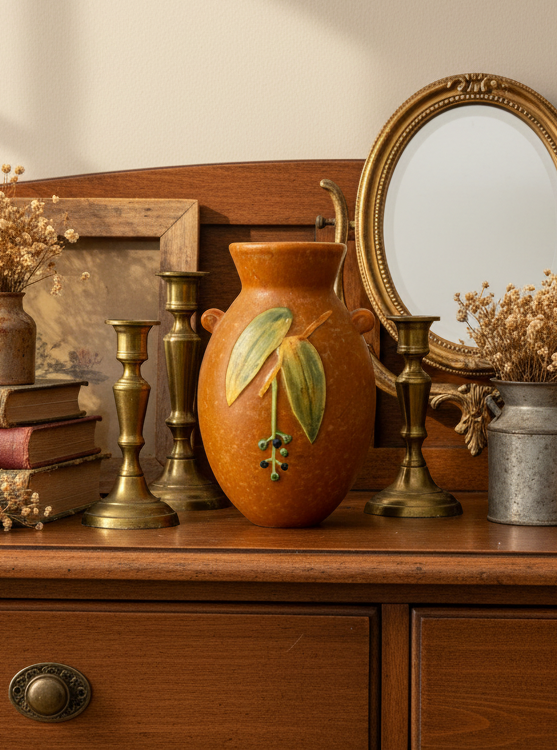 Turn it slightly and you’ll see how the glaze catches the light — a warm, earthy palette that layers beautifully into cottage, traditional, and grandmillennial-inspired interiors.
