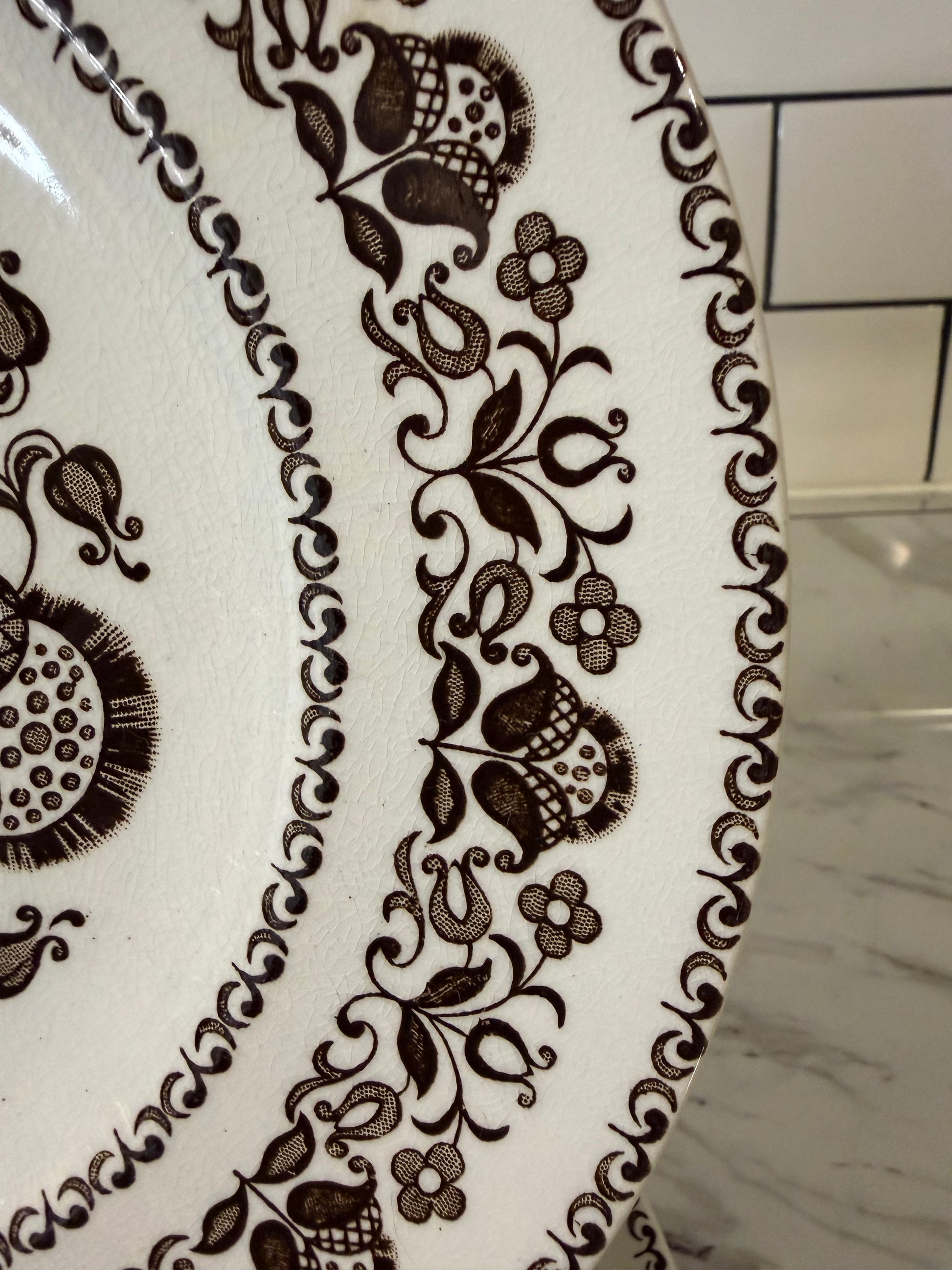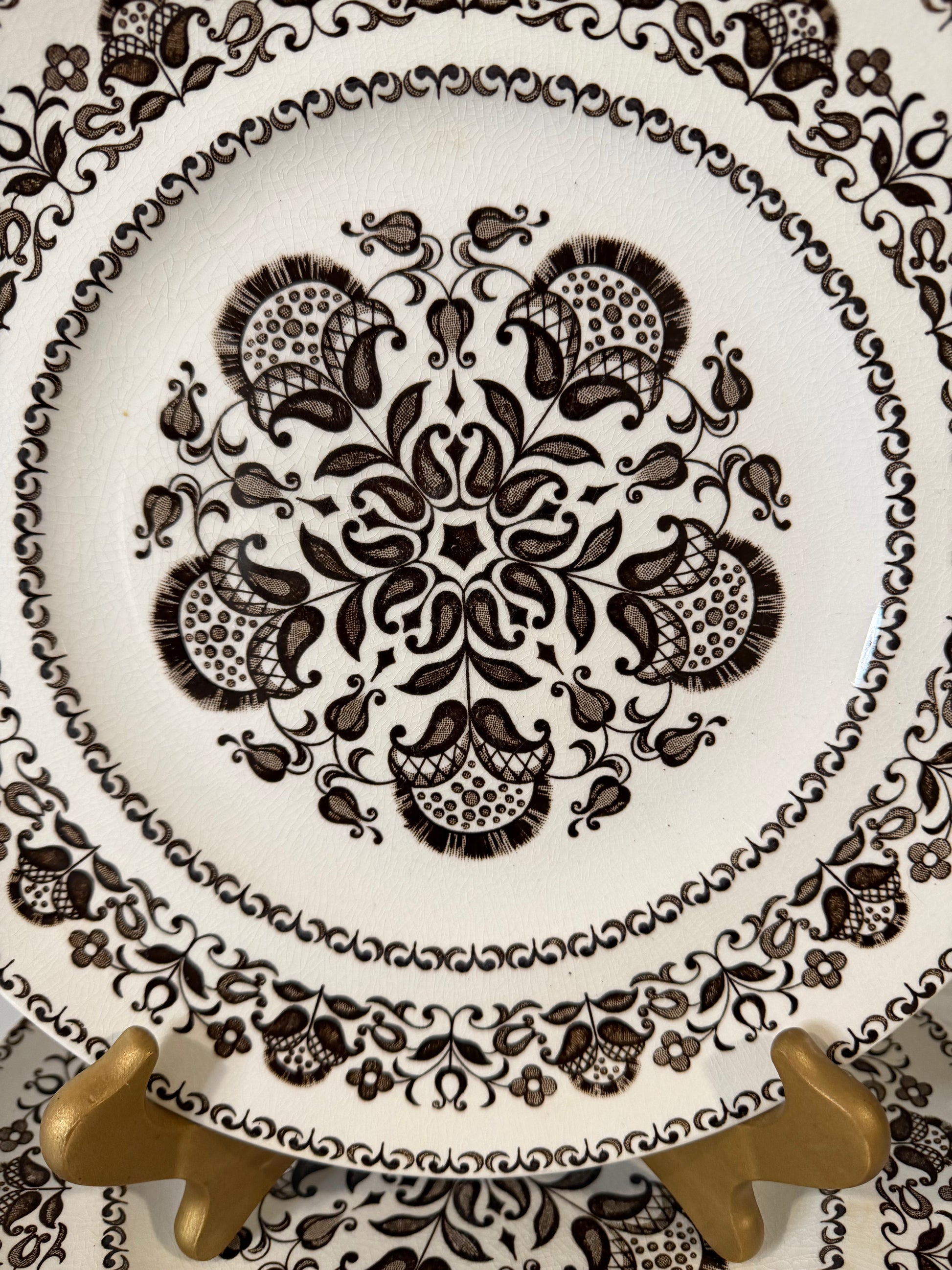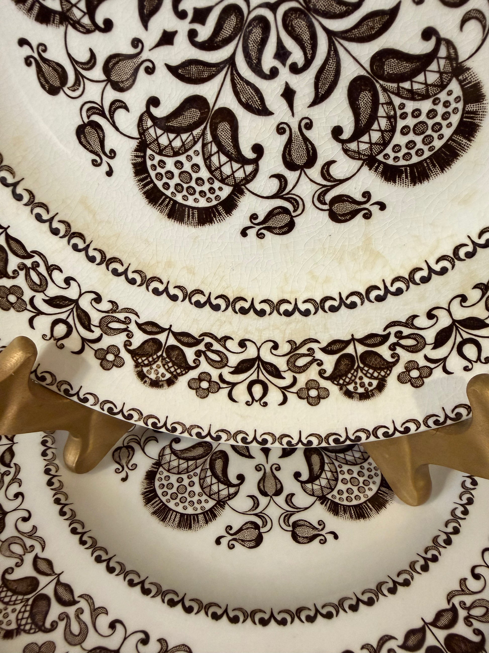 This vintage brown and cream china dates back to the 1950s–1960s and features a distinctive floral and paisley-like border with a matching center design.