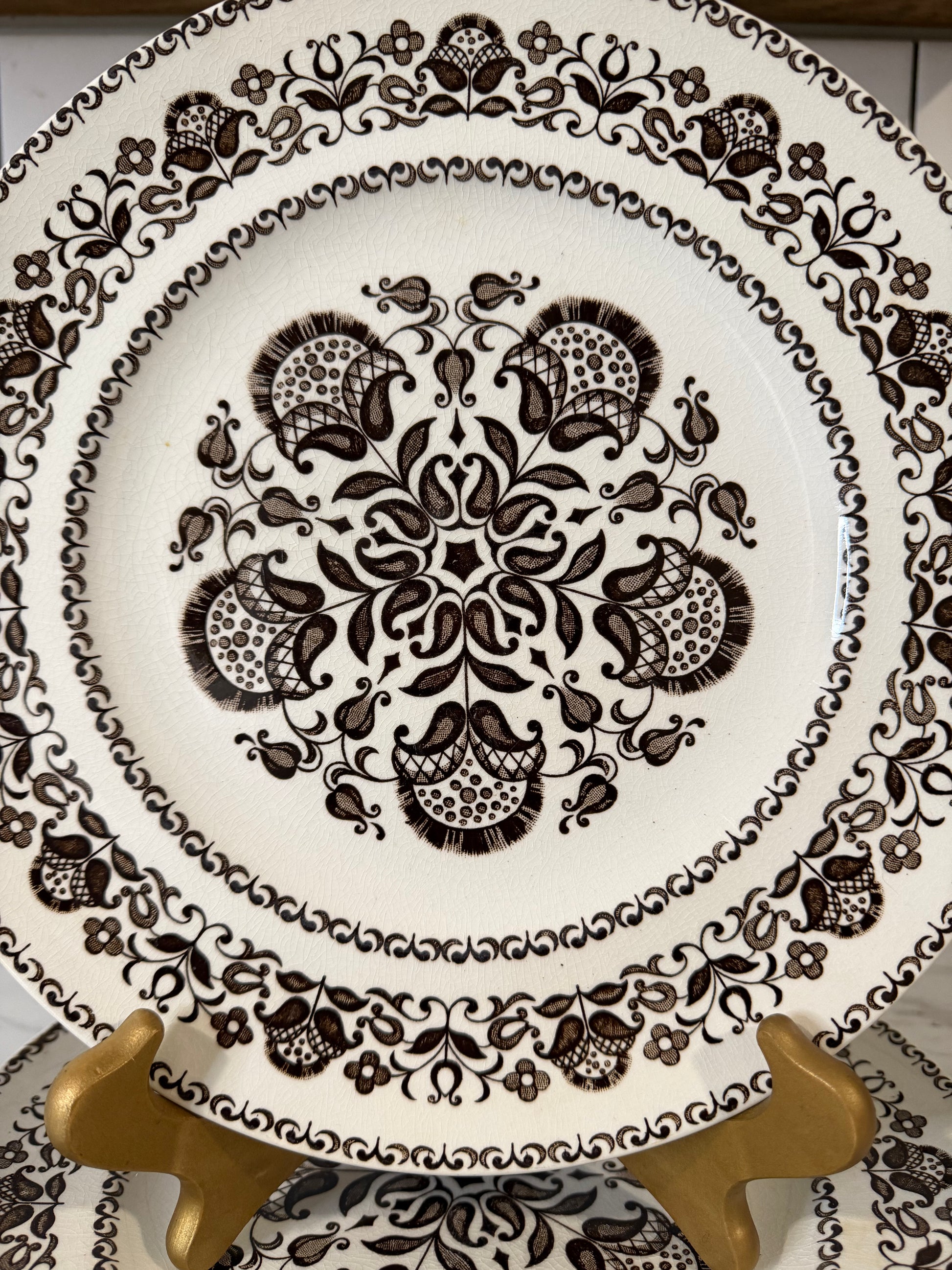 Timeless mid-century transferware — perfect for collectors, wall displays, or adding a touch of vintage charm to your table. These also mix beautifully with other brown transferware patterns, making them versatile for display or use.